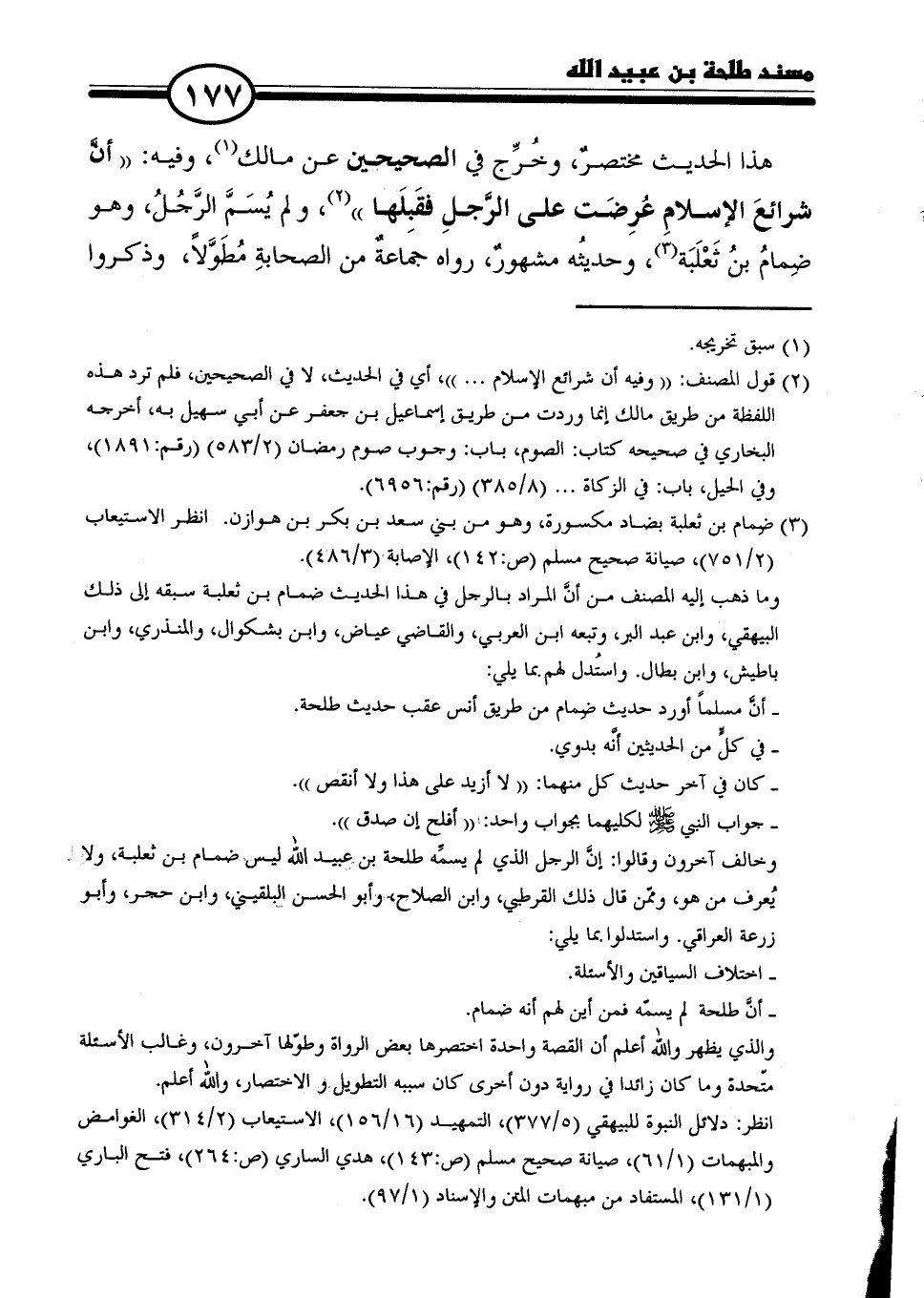 - أنَّ مسلمًا أورد حديث ضِمام من طريق أنس عقب حديث طلحة.