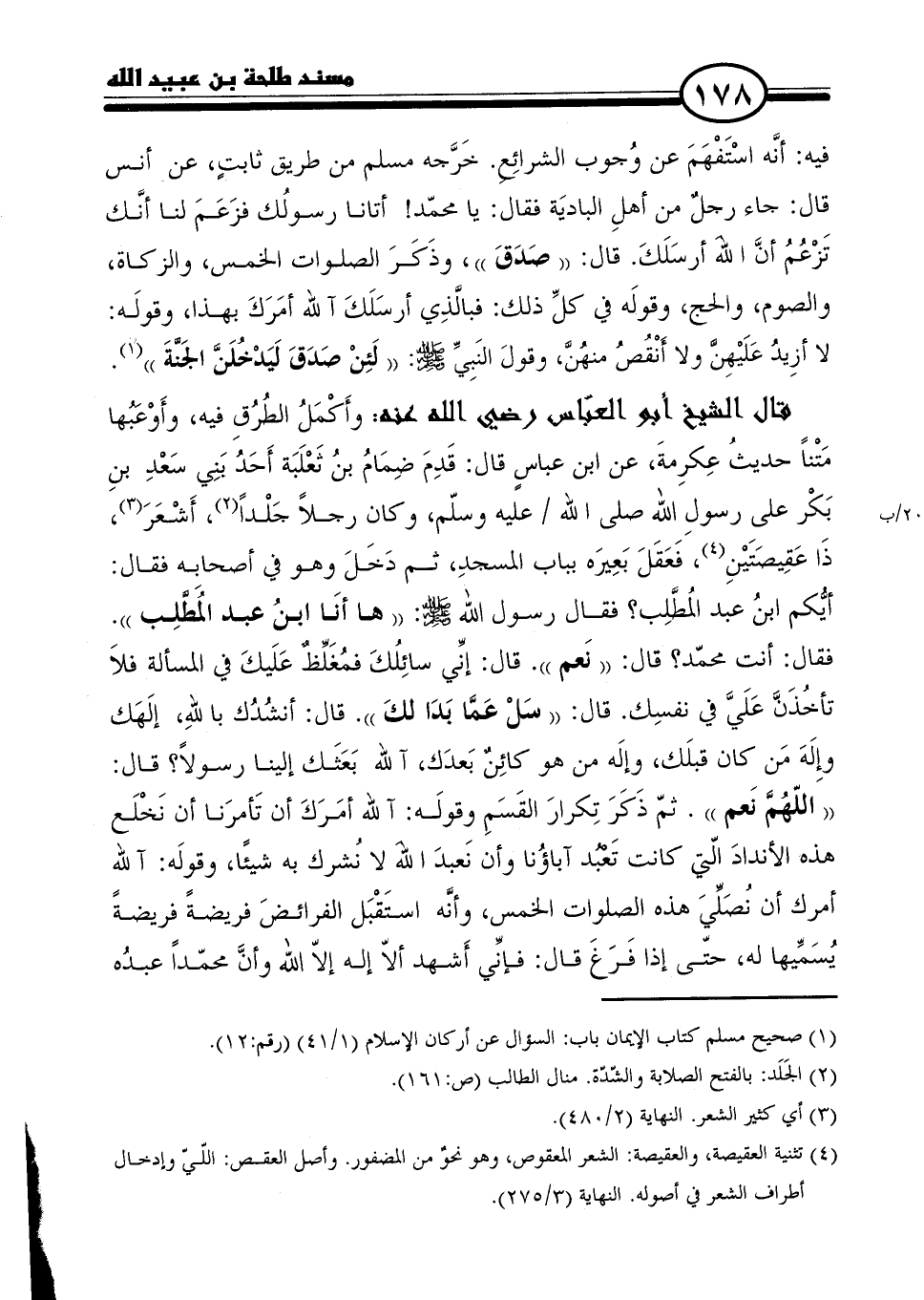 قال الشيخ أبو العبَّاس رضي الله عنه: وأَكْمَلُ الطرُقِ فيه، وأَوْعَبُها مَتْنًا حديث عِكرِمةَ، عن ابن عباسٍ قال: قَدِمَ ضِمَامُ بنُ ثَعْلَبَة أَحَدُ بَنِي سَعْدِ بنِ بَكْر على رسولِ الله صلى الله عليه وسلَّم، وكان رجلًا جَلْدًا (٢)، أَشْعَرَ (٣)، ذَا عَقِيصَتَيْنِ (٤)، فَعَقَلَ بَعِيرَه بباب المسجدِ، ثم دَخَلَ وهو في أصحابه فقال: أيُّكم ابنُ عبد المُطَّلِب؟ فقال رسول الله - صلى الله عليه وسلم -: (ها أنَا ابنُ عبد المُطَّلِب". فقال: أنت محمّد؟ قال: "نَعم". قال: إنِّي سائِلُكَ فمُغَلِّظٌ عَلَيكَ في المسألة فلَا تأخُذَنَّ عَلَيَّ في نفسِك. قال: "سَلْ عَمَّا بَدَا لكَ". قال: أنشُدُك باللهِ، إلَهَك وإِلَهَ مَن كان قبلَك، وإلَه من هو كائِنٌ بَعدَك، آلله بَعَثَك إلينا رسولًا؟ قال: "اللَّهُمَّ نَعم". ثمّ ذَكَرَ تِكرارَ القَسَمِ وقولَه: آلله أمَرَكَ أن تَأمرَنا أن نَخْلَع هذه الأندادَ الّتي كانت تَعْبُد آباؤُنا وأن نَعبدَ اللهَ لا نُشرك به شيئًا، وقولَه: آلله أمرك أن نُصَلِّيَ هذه الصلوات الخمس، وأنَّه استَقْبَل الفرائضَ فريضةً فريضةً يُسَمِّيها له، حتَّى إذا فَرَغَ قال: فإنِّي أَشهد ألّا إله إلّا الله وأنَّ محمّدًا عبدُه