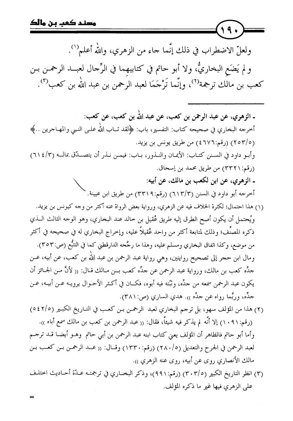 ولم يَضَعِ البخاريُّ، ولا أبو حاتم في كتابيهِما في الرِّجال لعبد الرحمن بن كعب بن مالك ترجمة (٢)، وإنَّما تَرْجَمَا لعبد الرحمن بن عبد الله بن كعب (٣).
