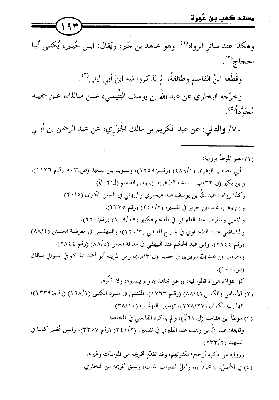ومصعب بن عبد الله الزبيري في حديثه (ل: ٣ /ب)، ومن طريقه أبو أحمد الحاكم في عوالي مالك (ص: ١٠٠). كل هؤلاء الرواة قالوا فيه: (عن مجاهد) ولم ينسبوه، ولا كنّوه.
