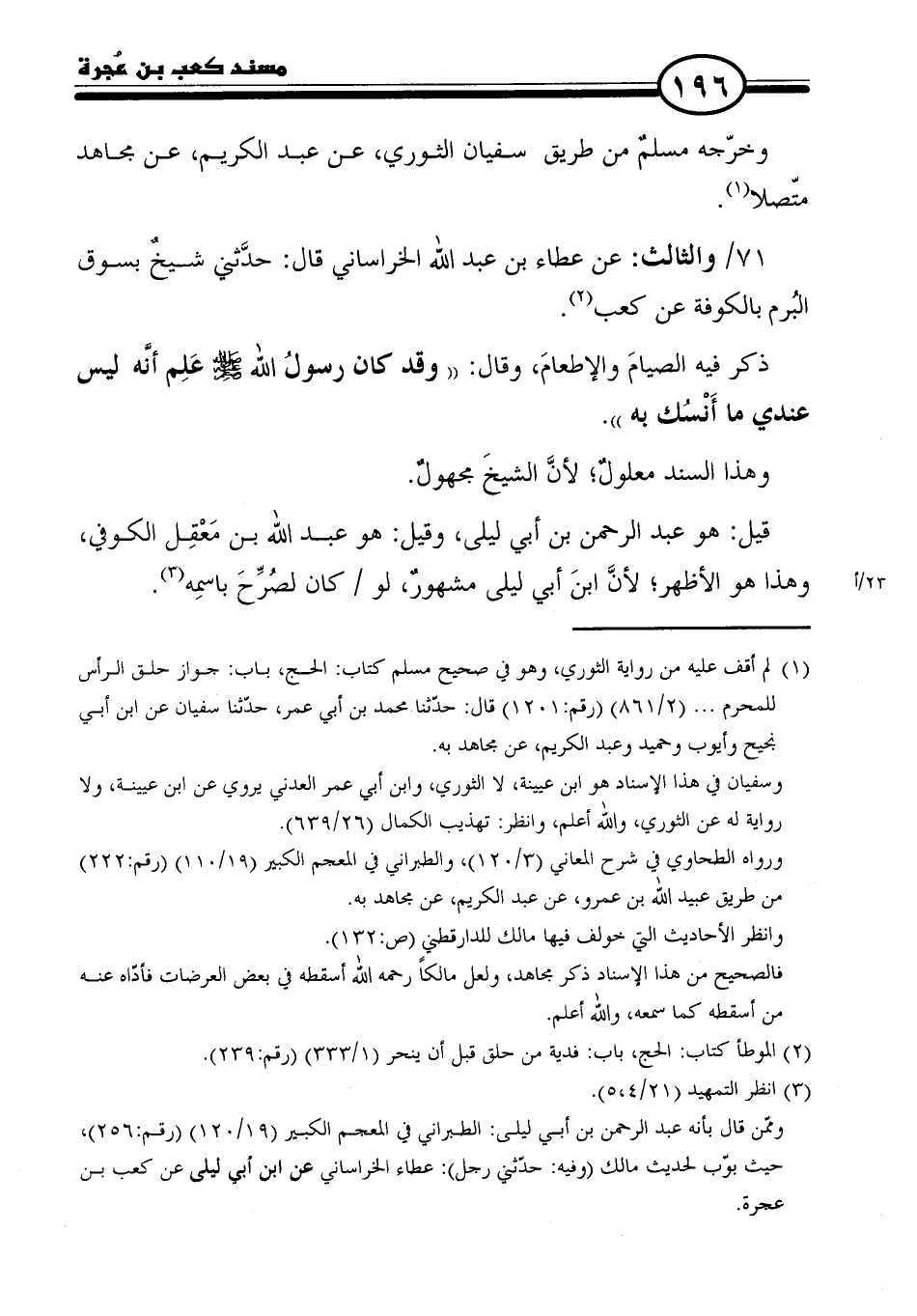 وممّن قال بأنه عبد الرحمن بن أبي ليلى: الطبراني في المعجم الكبير (١٩/ ١٢٠) (رقم: ٢٥٦)، حيث بوّب لحديث مالك (وفيه: حدّثني رجل): عطاء الخراساني عن ابن أبي ليلى عن كعب بن عجرة.