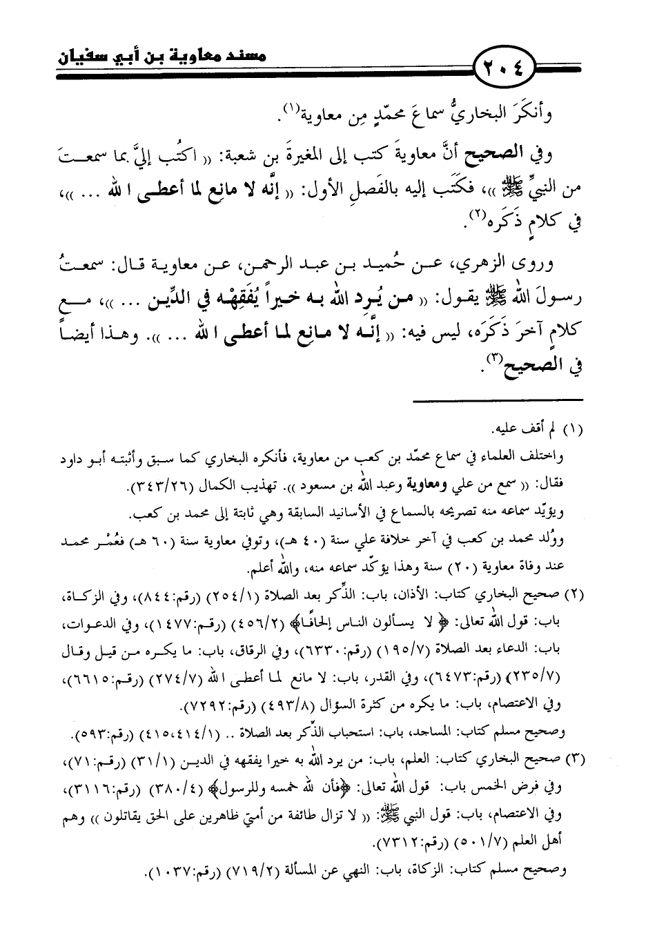 وروى الزهري، عن حُميد بن عبد الرحمن، عن معاوية قال: سمعتُ رسولَ الله - صلى الله عليه وسلم - يقول: "من يُرِد الله به خيرًا يُفَقِهْه في الدِّين ... "، مع كلامٍ آخرَ ذَكَرَه، ليس فيه: "إنَّه لا مانِع لما أعطى الله. . .". وهذا أيضًا في الصحيح (٣).