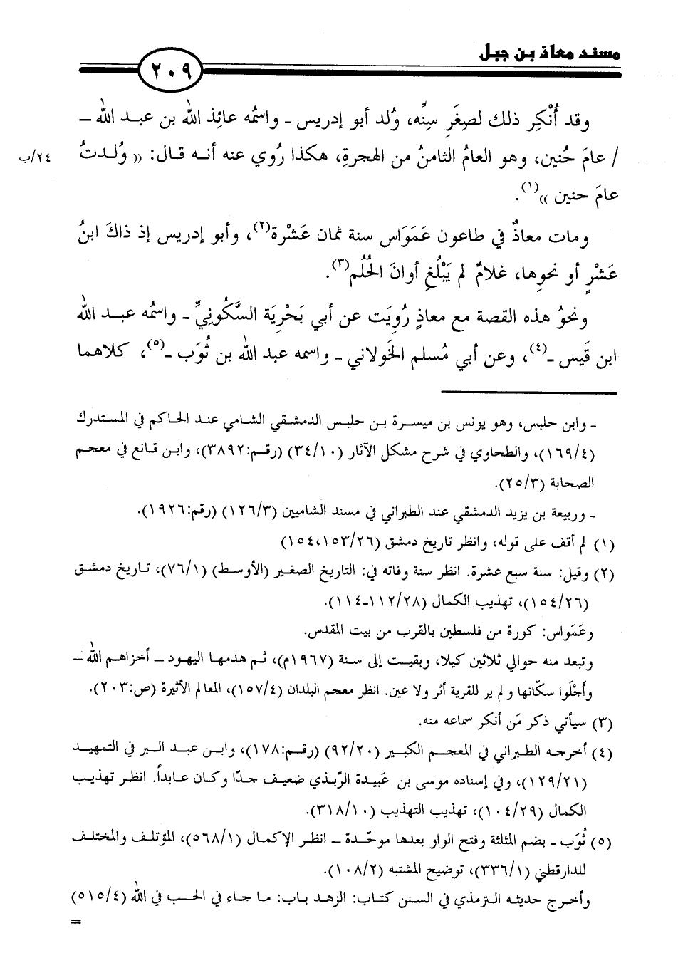 ومات معاذٌ في طاعون عَمَوَاس سنة ثمان عَشْرة (٢)، وأبو إدريس إذ ذاكَ ابنُ عَشْرٍ أو نحوِها، غلامٌ لم يَبْلُغ أوانَ الحُلُم (٣).