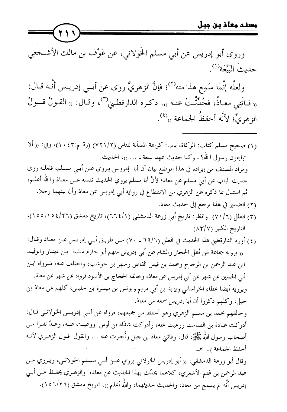 وخالفهم محمد بن مسلم الزهري وهو أحفظ من جميعهم، فرواه عن أبي إدريس الخولاني قال: أدركت عبادة بن الصامت ووعيت عنه، وأدركت شدّاد بن أوس ووعيت عنه، وعدّ نفرا من أصحاب رسول الله - صلى الله عليه وسلم -، قال: وفاتني معاذ بن جبل وأُخبرت عنه. . . والقول قول الزهري لأنه أحفظ الجماعة" اهـ.
