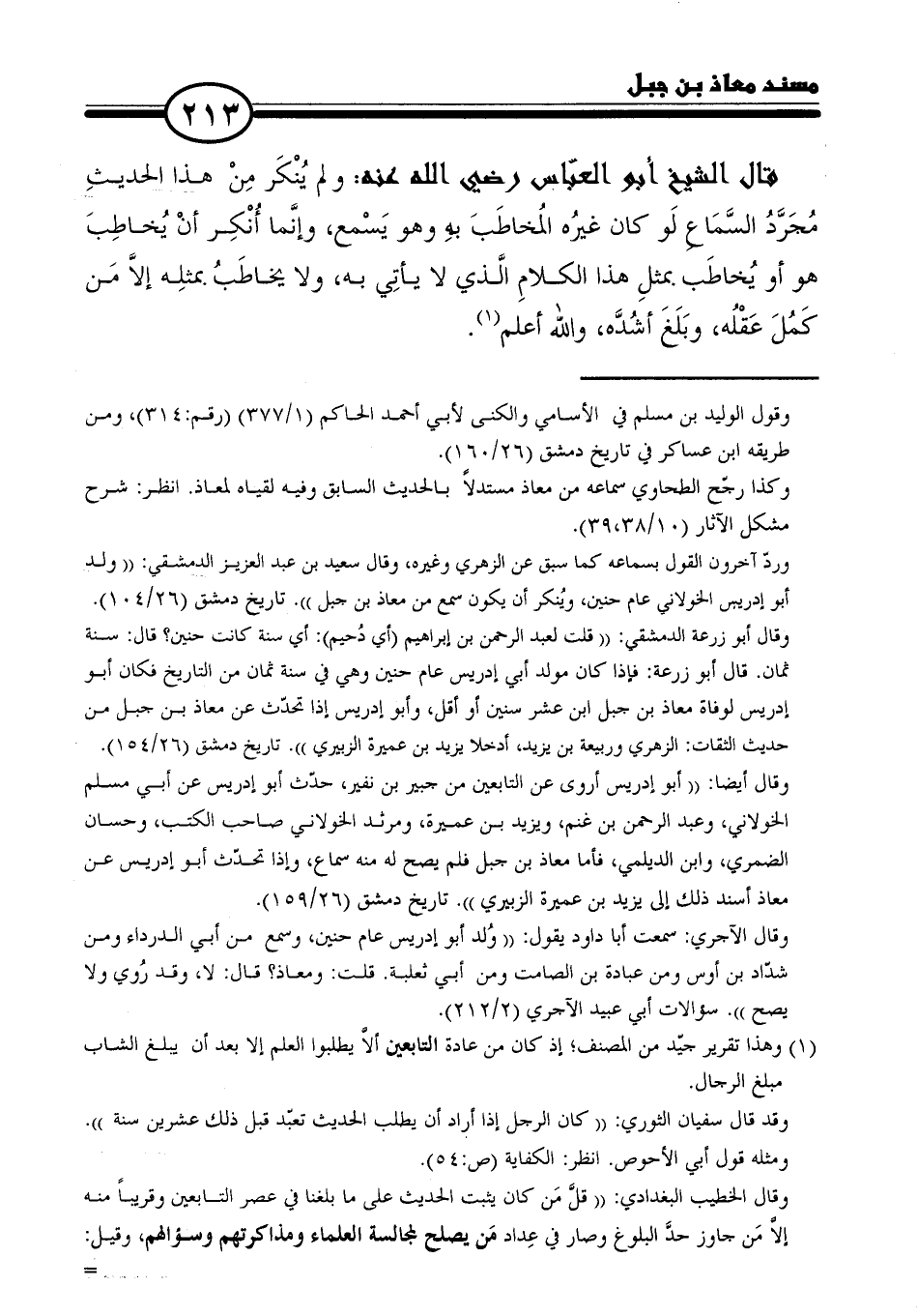 وردّ آخرون القول بسماعه كما سبق عن الزهري وغيره، وقال سعيد بن عبد العزيز الدمشقي: "ولد أبو إدريس الخولاني عام حنين، ويُنكر أن يكون سمع من معاذ بن جبل". تاريخ دمشق (٢٦/ ١٠٤). وقال أبو زرعة الدمشقي: "قلت لعبد الرحمن بن إبراهيم (أي دُحيم): أي سنة كانت حنين؟ قال: سنة ثمان. قال أبو زرعة: فإذا كان مولد أبي إدريس عام حنين وهي في سنة ثمان من التاريخ فكان أبو إدريس لوفاة معاذ بن جبل ابن عشر سنين أو أقل، وأبو إدريس إذا تحدّث عن معاذ بن جبل من حديث الثقات: الزهري وربيعة بن يزيد، أدخلا يزيد بن عميرة الزبيري". تاريخ دمشق (٢٦/ ١٥٤).