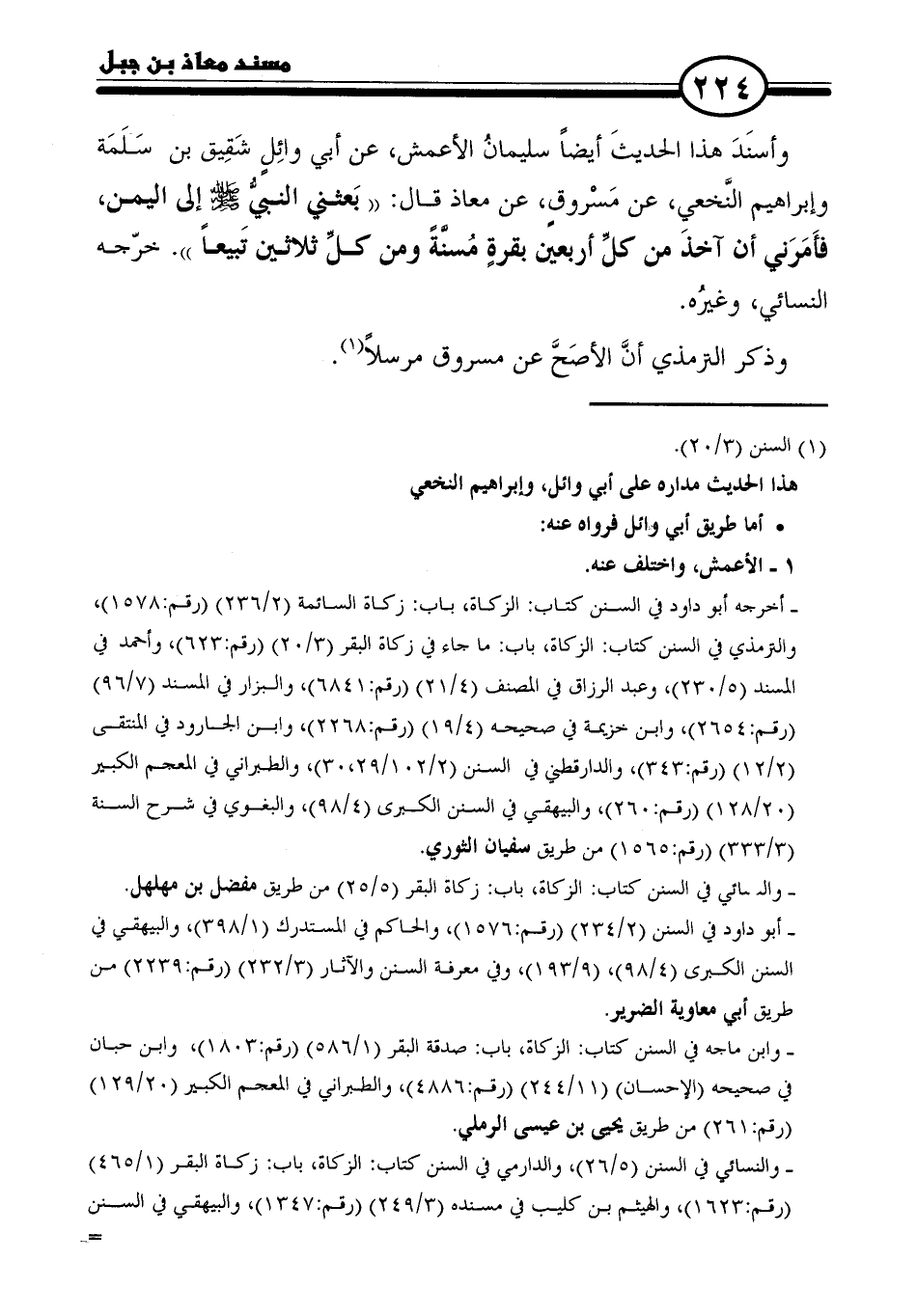 وأسنَدَ هذا الحديثَ أيضًا سليمانُ الأعمش، عن أبي وائِلٍ شَقِيق بن سَلَمَة وإبراهيم النَّخعي، عن مَسْروقٍ، عن معاذ قال: "بَعثني النبيُّ - صلى الله عليه وسلم - إلى اليمن، فأَمَرَني أن آخذَ من كلِّ أربعين بقرةٍ مُسنَّةً ومن كلِّ ثلاثين تَبيعًا". خرّجه النسائي، وغيرُه.