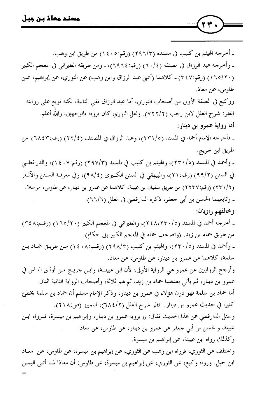 - وأحمد في المسند (٥/ ٢٣٠)، والهيثم بن كليب (٣/ ٢٩٨) (رقم: ١٤٠٨) من طريق حماد بن سلمة، كلاهما عن عمرو بن دينار، عن طاوس، عن معاذ.