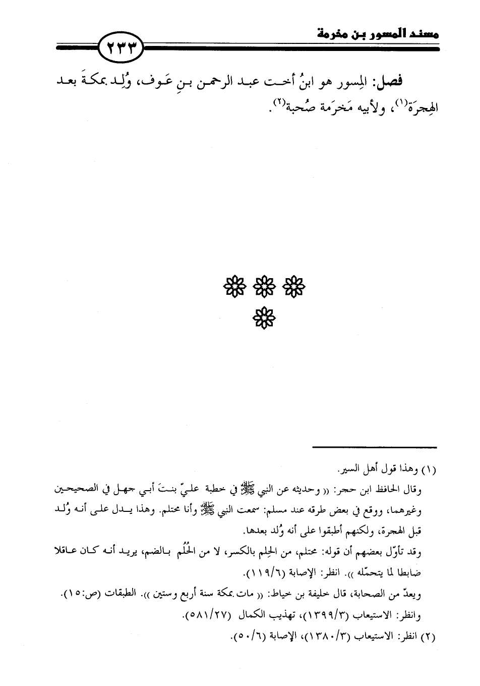 فصل: المِسور هو ابنُ أخت عبد الرحمن بنِ عَوف، وُلِد بمكةَ بعد الهِجرَة (١)، ولأبيه مَخرَمة صُحبة (٢).