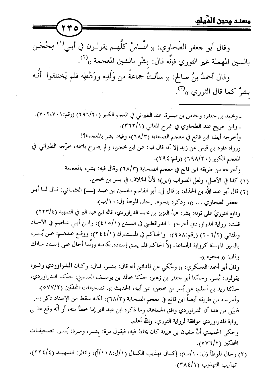وحكى الحميدي اْنَّ سفيان بن عيينة كان يخلط فيه، فيقول مرة: بِشر، ومرة: بُسر. تصحيفات المحدثين (٢/ ٥٧٦).