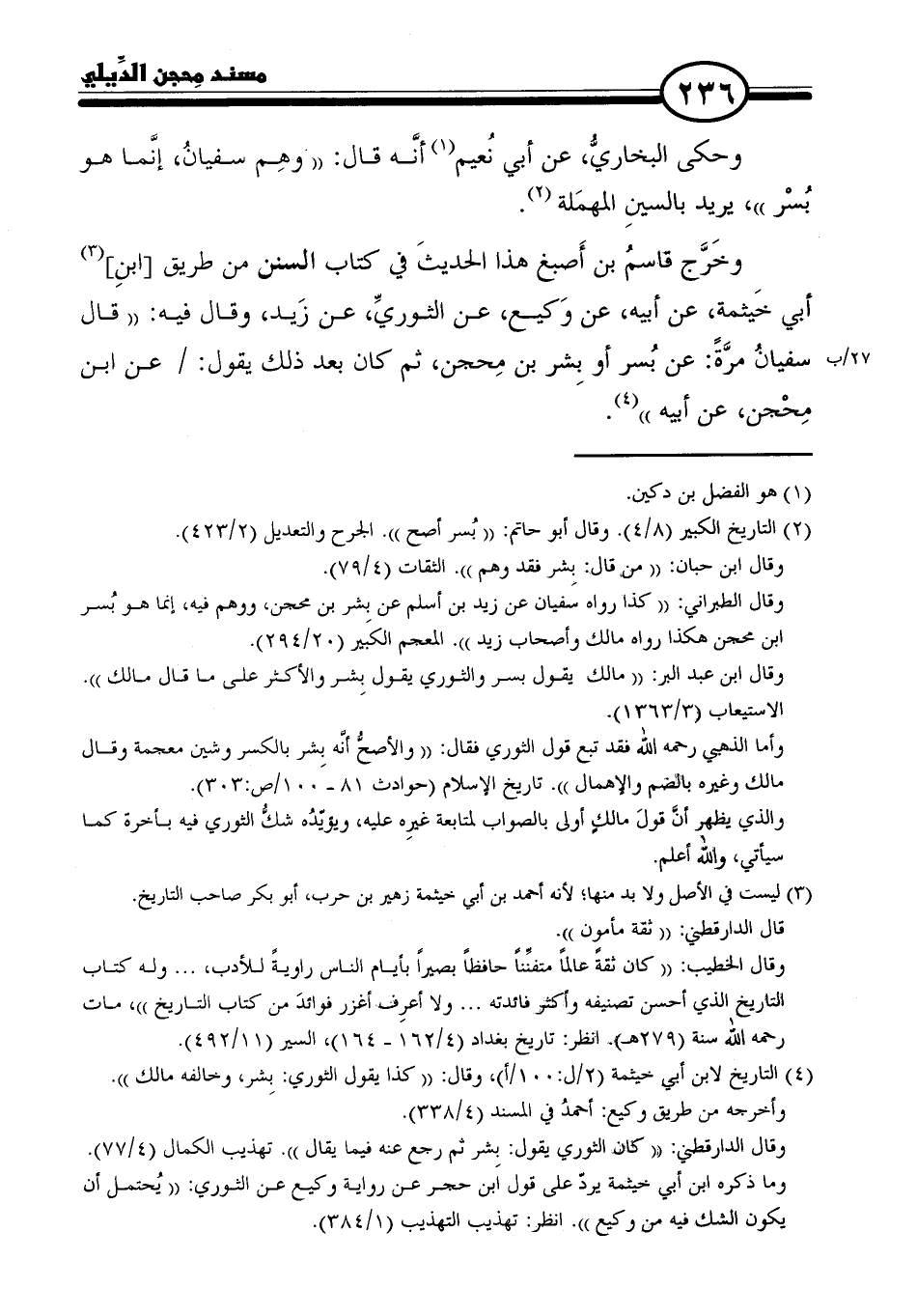 وحكى البخاريُّ، عن أبي نُعيم (١) أنَّه قال: "وهِم سفيانُ، إنَّما هو بُسْر"، يريد بالسينِ المهمَلة (٢).