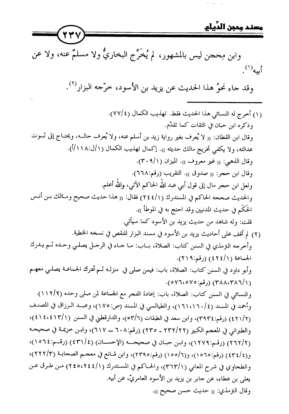 وابن مِحجن ليس بالمشهور، لم يُخَرِّج البخاريُّ ولا مسلمٌ عنه، ولا عن أبيه (١).
