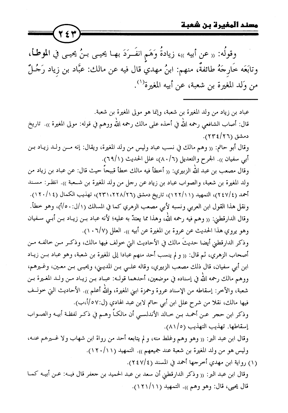 وقال مصعب بن عبد الله الزبيري: "أخطأ فيه مالك خطأ قبيحًا حيث قال: عن عباد بن زياد من ولد المغيرة بن شعبة، والصواب عباد بن زياد عن رجل من ولد المغيرة بن شعبة". انظر: مسند أحمد (٤/ ٢٤٧)، التمهيد (١١/ ١٢٢)، تاريخ دمشق (٢٦/ ٢٢٨، ٢٣١)، تهذيب الكمال (١٤/ ١٢٠). ونقل هذا القول ابن العربي ونسبه لأبي مصعب الزهري كما في المسالك، وهو خطأ. وقال الدارقطني: "وهم فيه رحمه الله، وهذا مما يعتدّ به عليه؛ لأنه عباد بن زياد بن أبي سفيان وهو يروي هذا الحديث عن عروة بن المغيرة عن أبيه". العلل (٧/ ١٠٦).