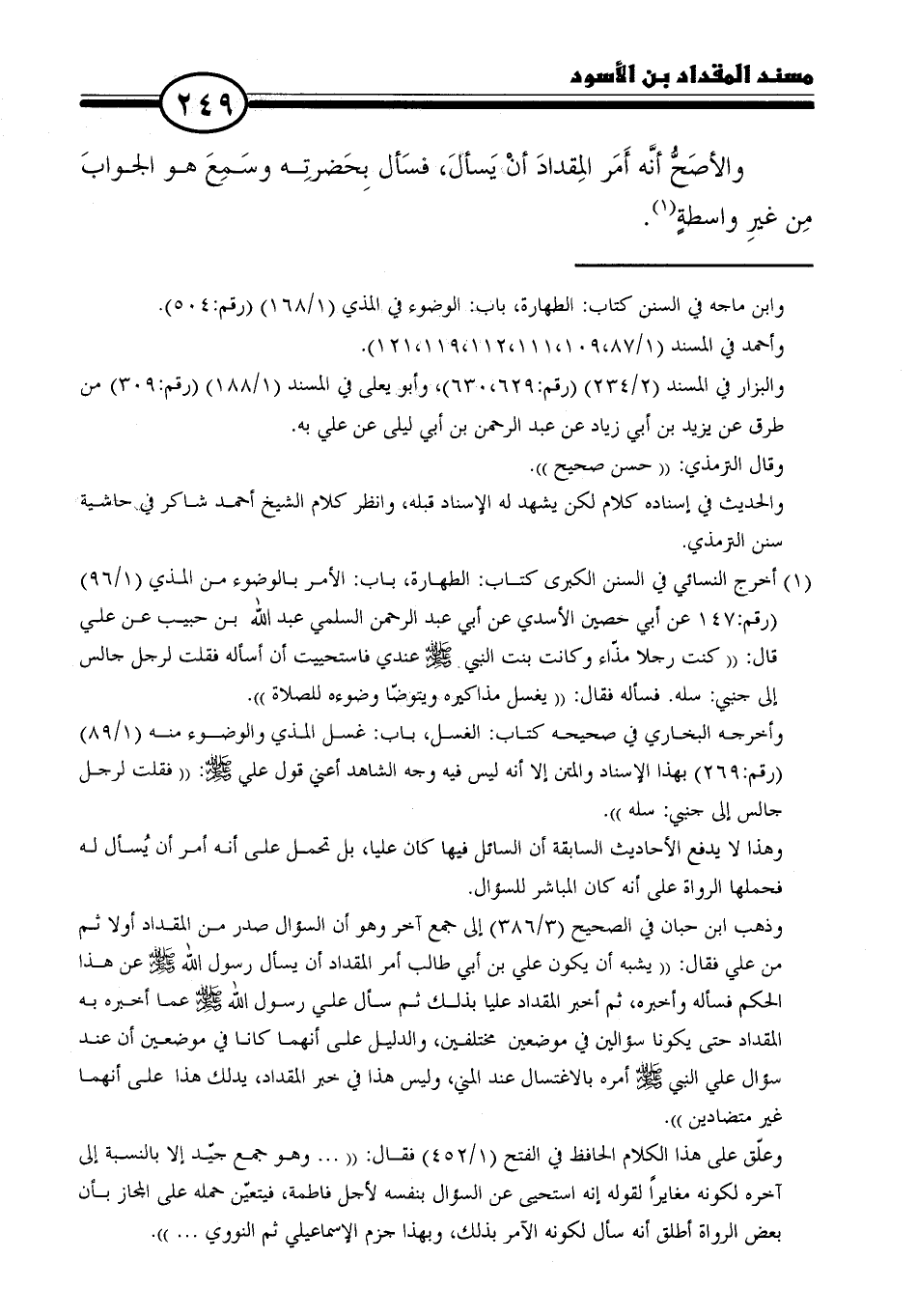 (١) أخرج النسائي في السنن الكبرى كتاب: الطهارة، باب: الأمر بالوضوء من المذي (١١/ ٩٦) (رقم: ١٤٧ عن أبي حصين الأسدي عن أبي عبد الرحمن السلمي عبد الله بن حبيب عن علي قال: "كنت رجلا مذاء وكانت بنت النبي - صلى الله عليه وسلم - عندي فاستحييت أن أسأله فقلت لرجل جالس إلى جني: سله. فسأله فقال: "يغسل مذاكيره، ويتوضّا وضوءه للصلاة".