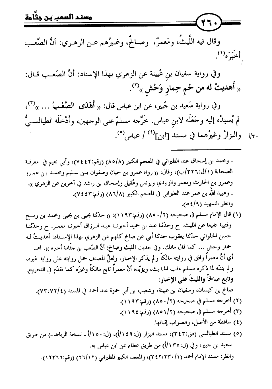 وفي رواية سَعيد بن جُبير، عن ابن عباس قال: "أَهْدَى الصَّعْبُ. . ." (٣)، لم يُسنِدْه إليه وجَعَلَه لابنِ عباس. خَرَّجه مسلمٌ على الوجهين، وأَدْخَلَه الطيالسيُّ والبزارُ وغيرُهما في مسند [ابن] (٤) عباس (٥).