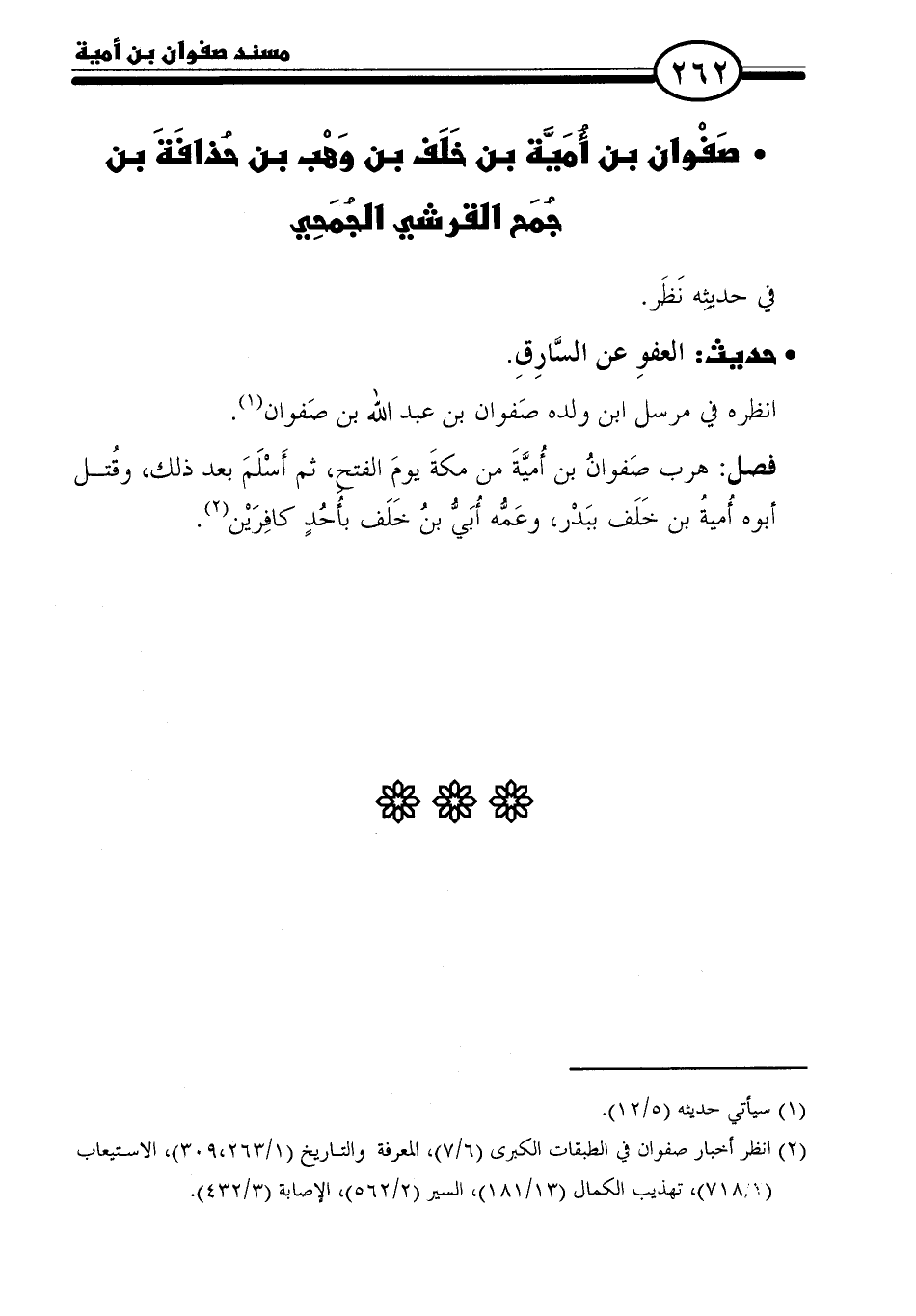 فصل: هرب صَفوان بن أُميَّةَ من مكةَ يومَ الفتح، ثم أَسْلَمَ بعد ذلك، وقُتل أبوه أُميةُ بن خَلَف ببَدْر، وعَمُّه أُبَيُّ بن خَلَف بأُحُدٍ كافِرَيْن (٢).