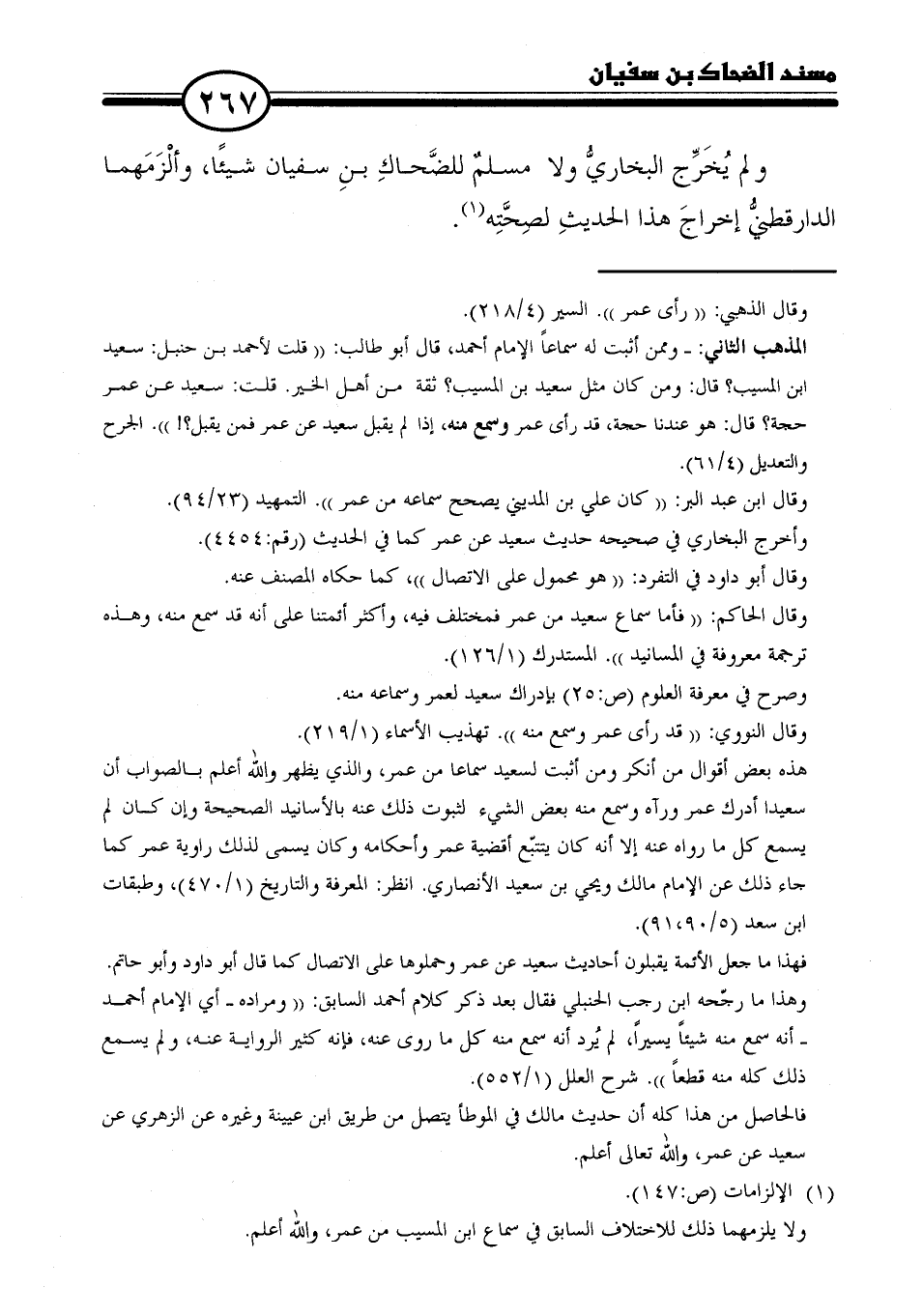هذه بعض أقوال من أنكر ومن أثبت لسعيد سماعا من عمر، والذي يظهر والله أعلم بالصواب أن سعيدا أدرك عمر ورآه وسمع منه بعض الشيء لثبوت ذلك عنه بالأسانيد الصحيحة وإن كان لم يسمع كل ما رواه عنه إلا أنه كان يتتبّع أقضية عمر وأحكامه وكان يسمى لذلك راوية عمر كما جاء ذلك عن الإمام مالك ويحيى بن سعيد الأنصاري. انظر: المعرفة والتاريخ (١/ ٤٧٠)، وطبقات ابن سعد (٥/ ٩٠، ٩١).