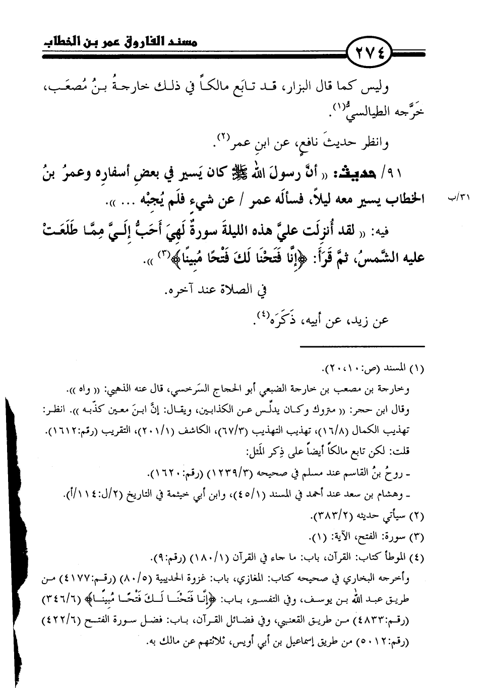 ٩١ / حديث: "أنَّ رسولَ الله - صلى الله عليه وسلم - كان يَسير في بعضِ أسفارِه وعمرُ بنُ الخطاب يسير معه ليلًا، فسألَه عمر عن شيءٍ فلَم يُجِبْه. . .".