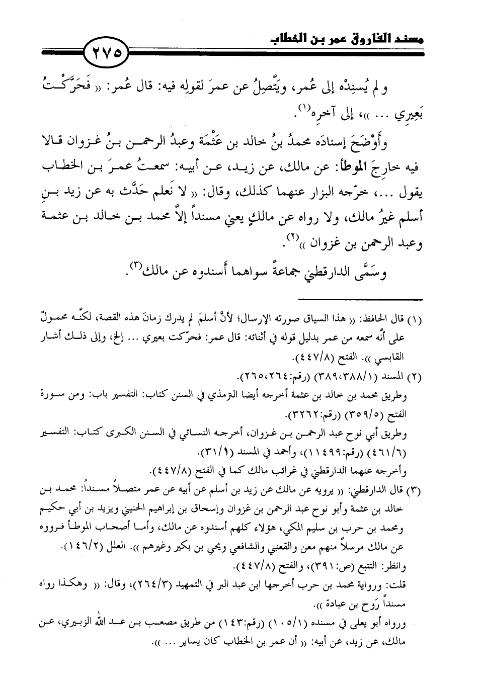 (٣) قال الدارقطني: "يرويه عن مالك عن زيد بن أسلم عن أبيه عن عمر متصلًا مسندًا: محمد بن خالد بن عثمة وأبو نوح عبد الرحمن بن غزوان وإسحاق بن إبراهيم الحنيني ويزيد بن أبي حكيم ومحمد بن حرب بن سليم المكي، هؤلاء كلهم أسندوه عن مالك، وأما أصحاب الموطأ فرووه عن مالك مرسلًا منهم معن والقعنبي والشافعي ويحيى بن بكير وغيرهم". العلل (٢/ ١٤٦).