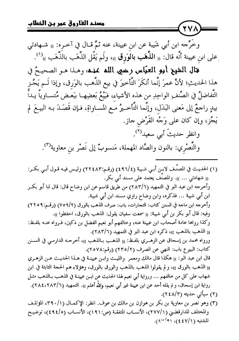وخَرَّجه ابن أبي شَيبة عن ابنِ عيينة، عنه ثمَّ قال في آخرِه: "شهادتي على ابنِ عيينة أنَّه قال: "الذَّهَب بالوَرِق"، ولَم يَقُل الذَّهَب بالذَّهَب" (١).