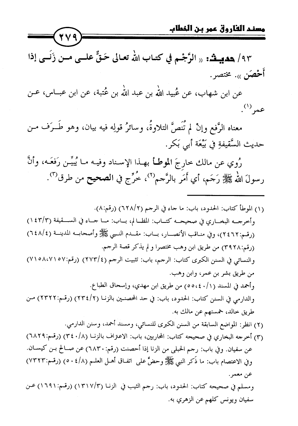 ٩٣/ حديث: "الرَّجْم في كتاب الله تعالى حَقٌّ على من زَنَى إذا أَحْصَن". مختصر.