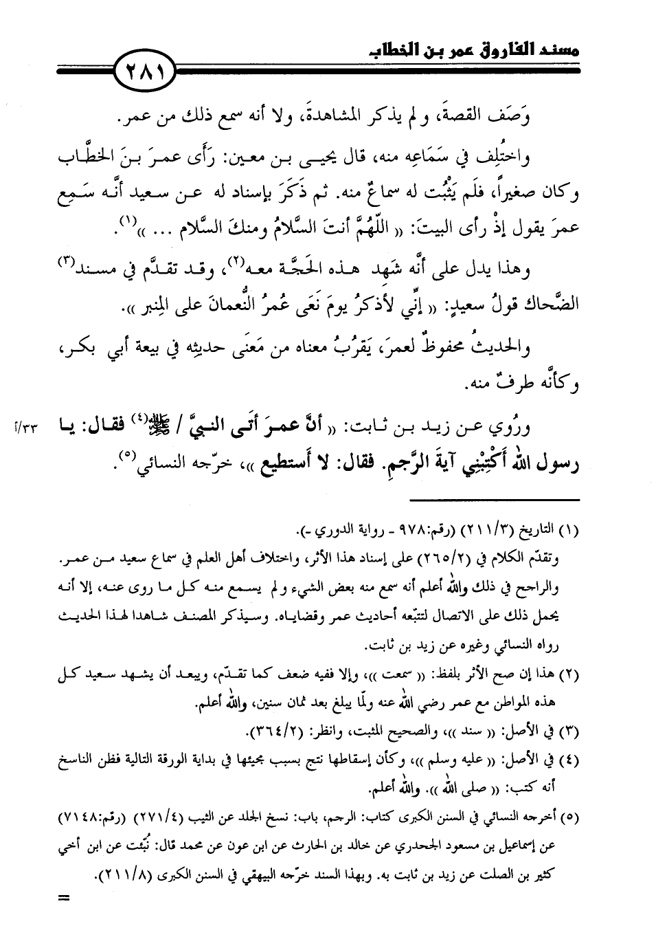 (٢) هذا إن صح الأثر بلفظ: "سمعت"، وإلا ففيه ضعف كما تقدّم، ويعد أن يشهد سعيد كل هذه المواطن مع عمر رضي الله عنه ولمّا يبلغ بعد ثمان سنين، والله أعلم.