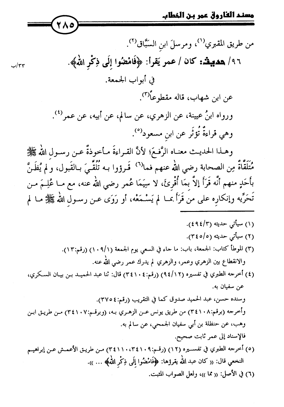 ٩٦/ حديث: كان عمر يَقرأ: (فَامْضُوا {فامْضُوْا إِلَى ذِكْرِ اللَّهِ}.