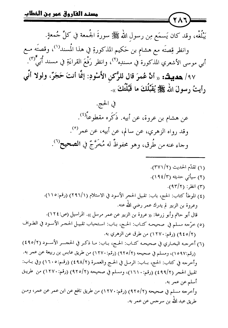 ٩٧ / حديث: "أنَّ عُمرَ قال للرُّكنِ الأَسْودِ: إنَّما أنتَ حَجَرٌ، ولولا أنِّي رأيتُ رسولَ الله - صلى الله عليه وسلم - يُقَبِّلُكَ ما قَبَّلْتُكَ".