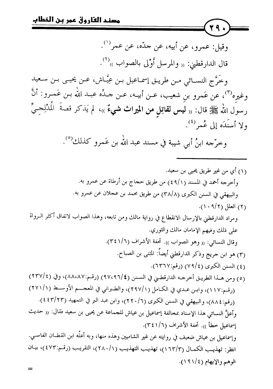 وخَرَّج النسائي من طريق إسماعيل بن عِيَّاش، عن يحيى بن سعيد وغيرِه (٣)، عن عَمرو بنِ شعيب، عن أبيه، عن جدِّه عبد الله بن عَمرو: أنَّ رسول الله - صلى الله عليه وسلم - قال: "ليس لقاتِلٍ من الميراث شيءٌ"، لم يَذكر قصةَ المُدْلِجِيِّ ولا أسنَدَه إلى عُمر (٤).