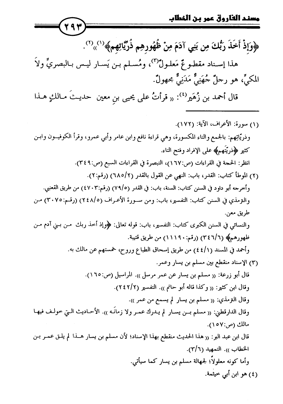 قال ابن عبد البر: "هذا الحديث منقطع بهذا الإسناد؛ لأن مسلم بن يسار هذا لم يلق عمر بن الخطاب". التمهيد (٣/ ٦).