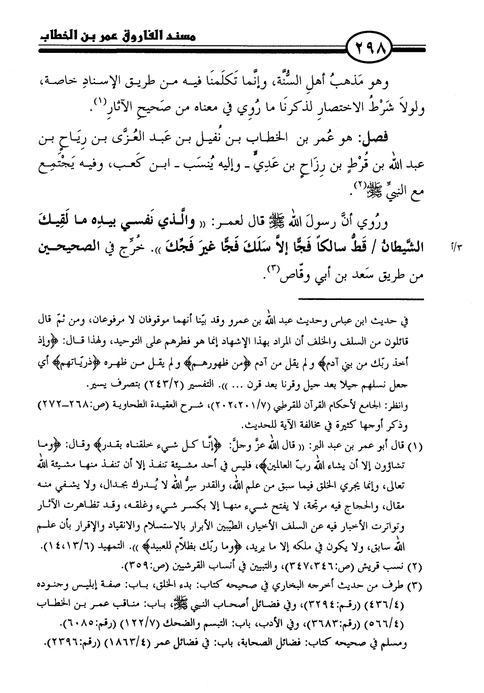 ورُوي أنَّ رسولَ الله - صلى الله عليه وسلم - قال لعمر: "والّذي نَفسي بيدِه ما لَقِيكَ الشَّيطان قَطُّ سالكًا فَجًّا إلاّ سَلَكَ فَجًّا غيرَ فَجِّكَ". خُرِّج في الصحيحين من طريق سَعد بن أبي وقّاص (٣).