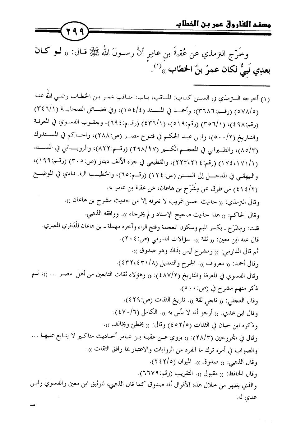 (١) أخرجه الترمذي في السنن كتاب: المناقب، باب: مناقب عمر بن الخطاب رضي الله عنه (٥/ ٥٧٨) (رقم: ٣٦٨٦)، وأحمد فى المسند (٤/ ١٥٤)، وفى فضائل الصحابة (١/ ٣٤٦) (رقم: ٤٩٨)، (١/ ٣٥٦) (رقم: ٥١٩)، (١/ ٤٣٦) (رقم: ٦٩٤)، ويعقوب الفسوي في المعرفة والتاريخ (٢/ ٥٠٠)، وابن عبد الحكم في فتوح مصر (ص: ٢٨٨)، والحاكم فى المستدرك (٣/ ٨٥)، والطبراني فى المعجم الكبير (١٧/ ٢٩٨) (رقم: ٨٢٢)، والروياني في المسند (١/ ١٧١، ١٧٤) (رقم: ٢١٤، ٢٢٣)، والقطيعي في جزء الألف دينار (ص: ٣٠٥) (رقم: ١٩٩)، والبيهقي فى المدخل إلى السنن (ص: ١٢٤) (رقم: ٦٥)، والخطيب البغدادي في الموضح (٢/ ٤١٤) من طرق عن مِشْرَح بن هاعان، عن عقبة بن عامر به.