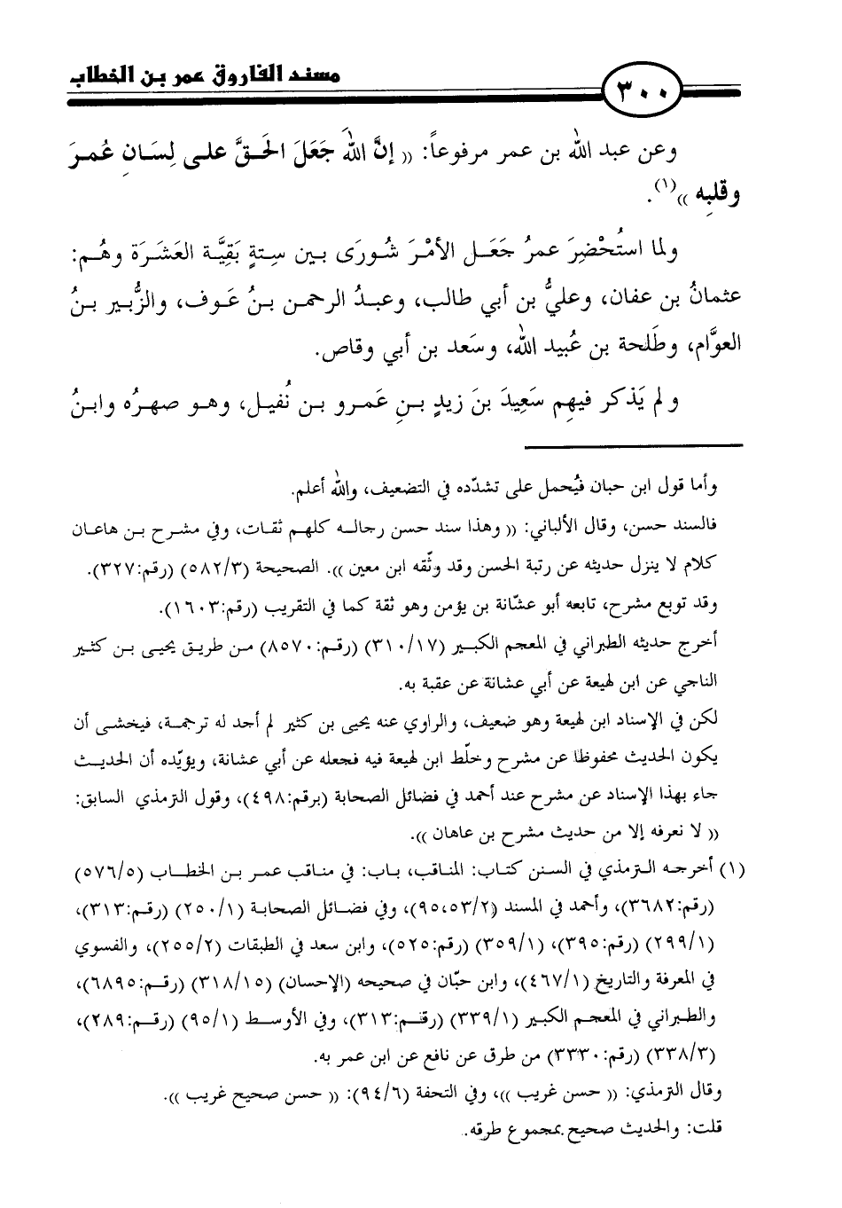 (١) أخرجه الترمذي في السنن كتاب: المناقب، باب: في مناقب عمر بن الخطاب (٥/ ٥٧٦) (رقم: ٣٦٨٢)، وأحمد فى المسند (٢/ ٥٣, ٩٥)، وفي فضائل الصحابة (١/ ٢٥٠) (رقم: ٣١٣)، (١/ ٢٩٩) (رقم: ٣٩٥)، (١/ ٣٥٩) (رقم: ٥٢٥)، وابن سعد فى الطبقات (٢/ ٢٥٥)، والفسوي فى المعرفة والتاريخ (١/ ٤٦٧)، وابن حبّان في صحيحه (الإحسان) (١٥/ ٣١٨) (رقم: ٦٨٩٥)، والطبراني في المعجم الكبير (١/ ٣٣٩) (رقم: ٣١٣)، وفي الأوسط (١/ ٩٥) (رقم: ٢٨٩)، (٣/ ٣٣٨) (رقم: ٣٣٣٠) من طرق عن نافع عن ابن عمر به.