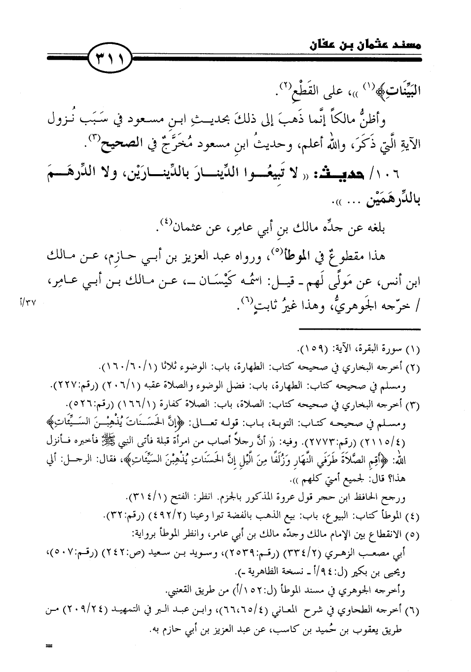 (٥) الانقطاع بين الإمام مالك وجدّه مالك بن أبي عامر، وانظر الموطأ برواية: