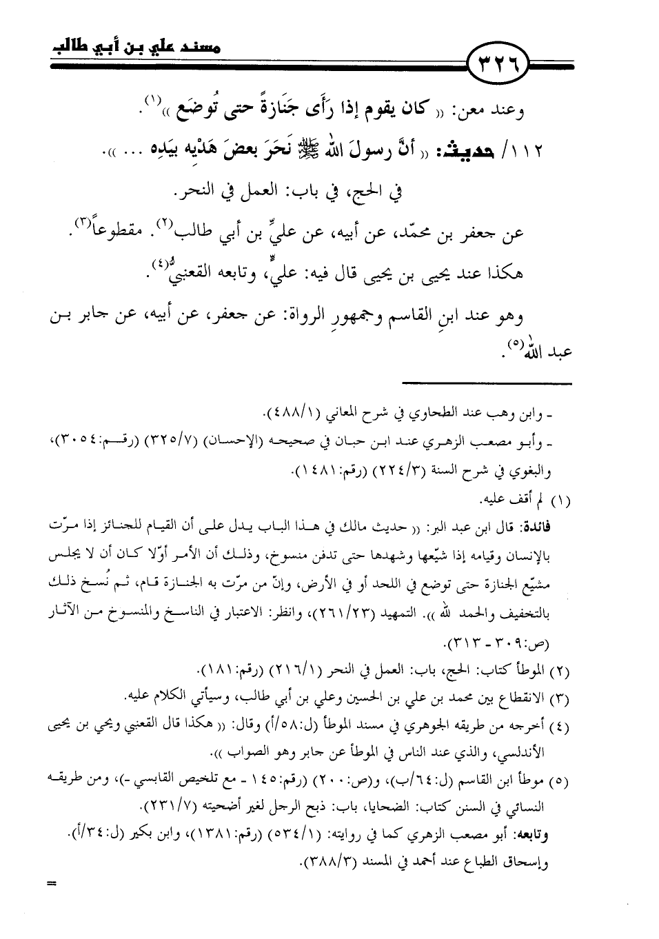 (٤) أخرجه من طريقه الجوهري في مسند الموطأ (ل: ٥٨/ أ) وقال: "هكذا قال القعنبي ويحيي بن يحيى الأندلسي، والذي عند الناس في الموطأ عن جابر وهو الصواب".