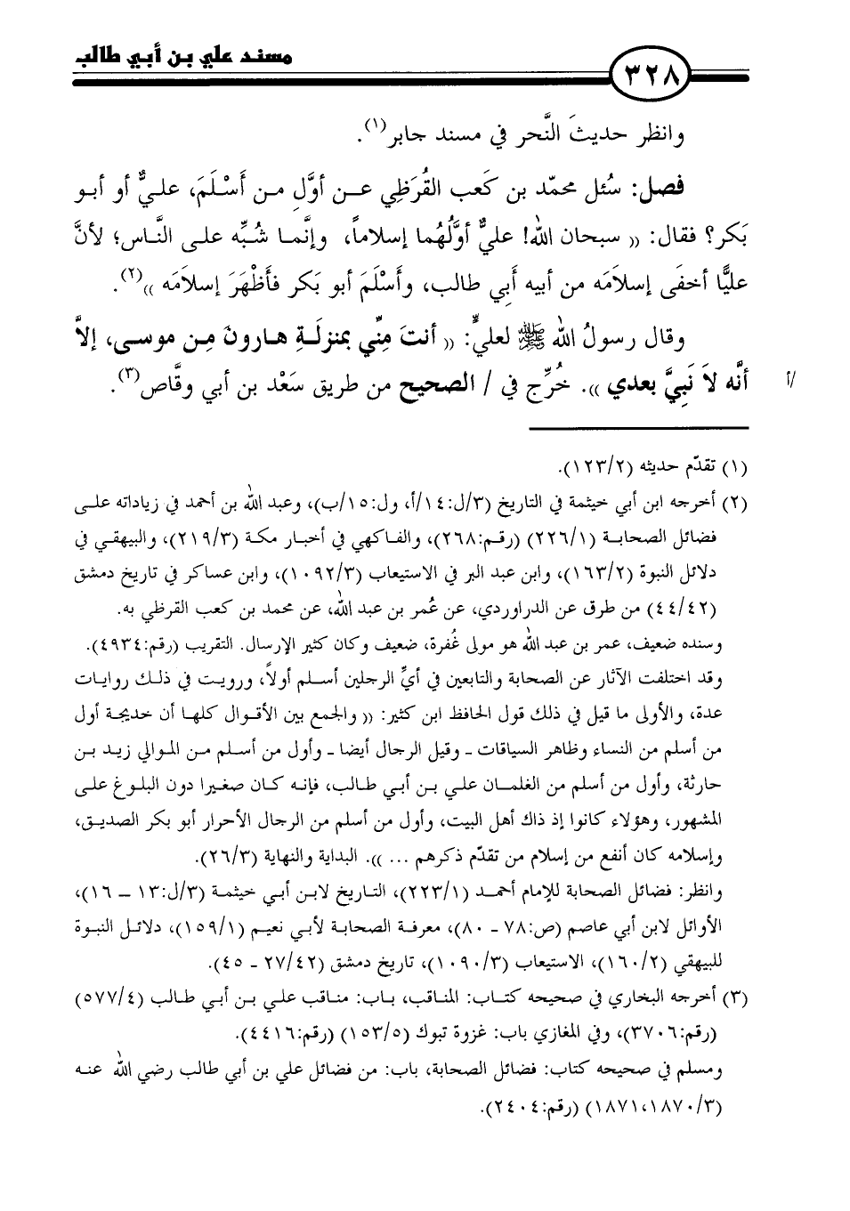 وقال رسولُ الله - صلى الله عليه وسلم - لعليٍّ: "أنتَ مِنِّي بمنزلَةِ هارونَ مِن موسى، إلَّا أنَّه لاَ نَبِيَّ بعدي". خُرِّج في الصحيح من طريق سَعْد بن أبي وقَّاص (٣).