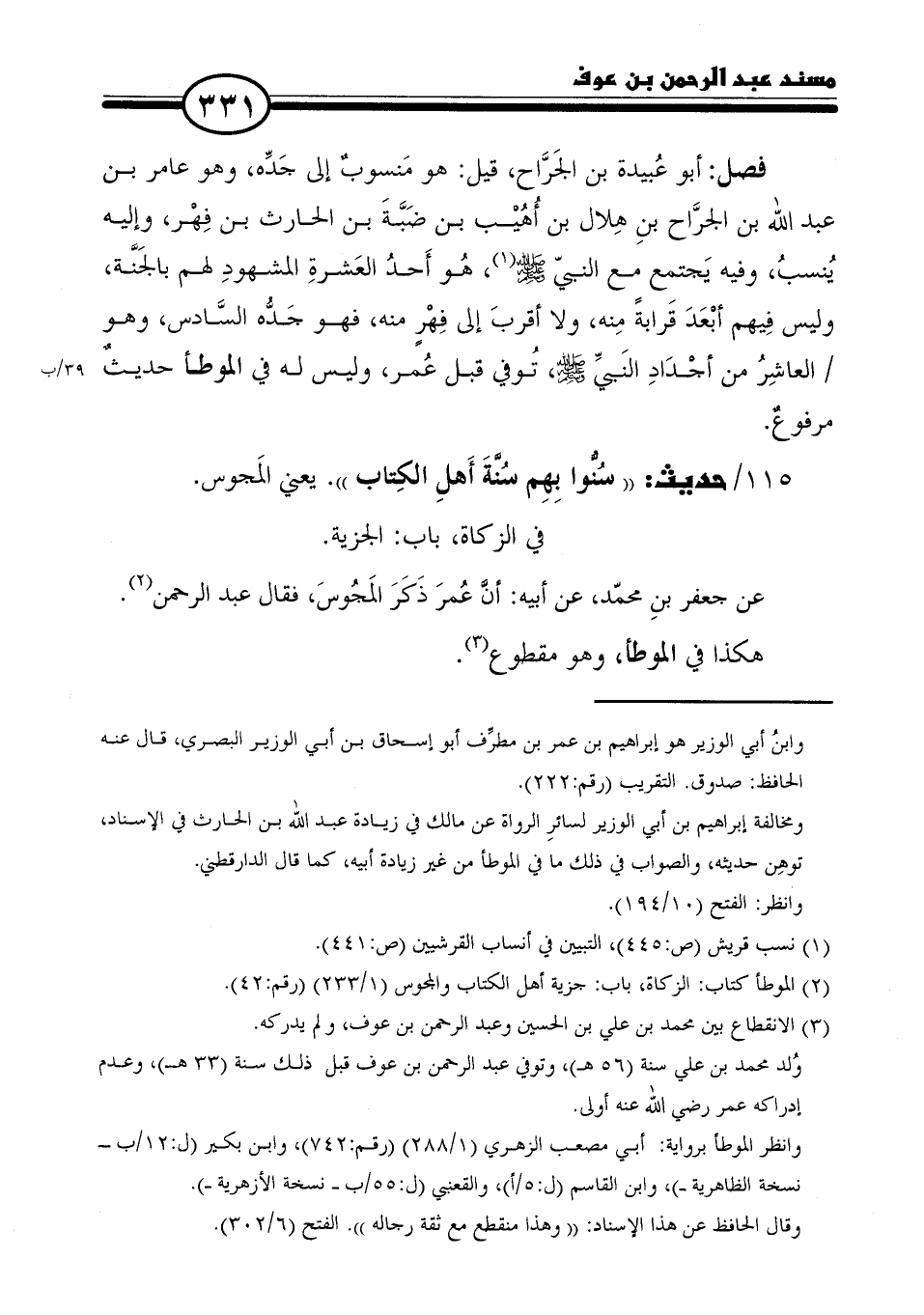 عن جعفر بنِ محمَّد، عن أبيه: أنَّ عُمرَ ذَكَرَ المَجُوسَ، فقال عبد الرحمن (٢).