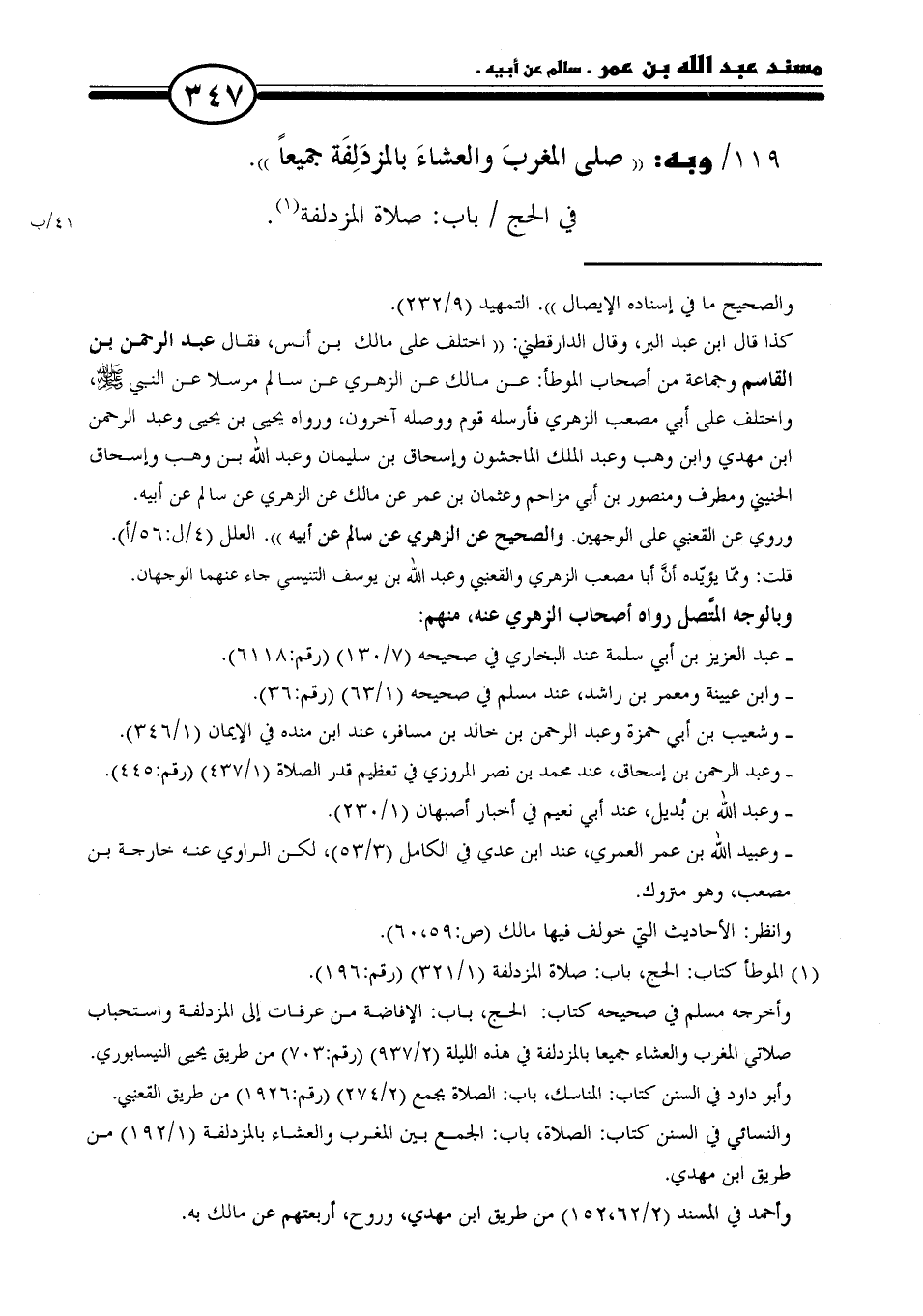 كذا قال ابن عبد البر، وقال الدارقطني: "اختلف على مالك بن أنس، فقال عبد الرحمن بن القاسم وجماعة من أصحاب الموطأ: عن مالك عن الزهرىِ عن سالم مرسلا عن النبي - صلى الله عليه وسلم -، واختلف على أبي مصعب الزهري فأرسله قوم ووصله آخرون، ورواه يحيى بن يحيى وعبد الرحمن بن مهدي وابن وهب وعبد الملك الماجشون وإسحاق بن سليمان وعبد الله بن وهب وإسحاق الحنيني ومطرف ومنصور بن أبي مزاحم وعثمان بن عمر عن مالك عن الرهري عن سالم عن أبيه.