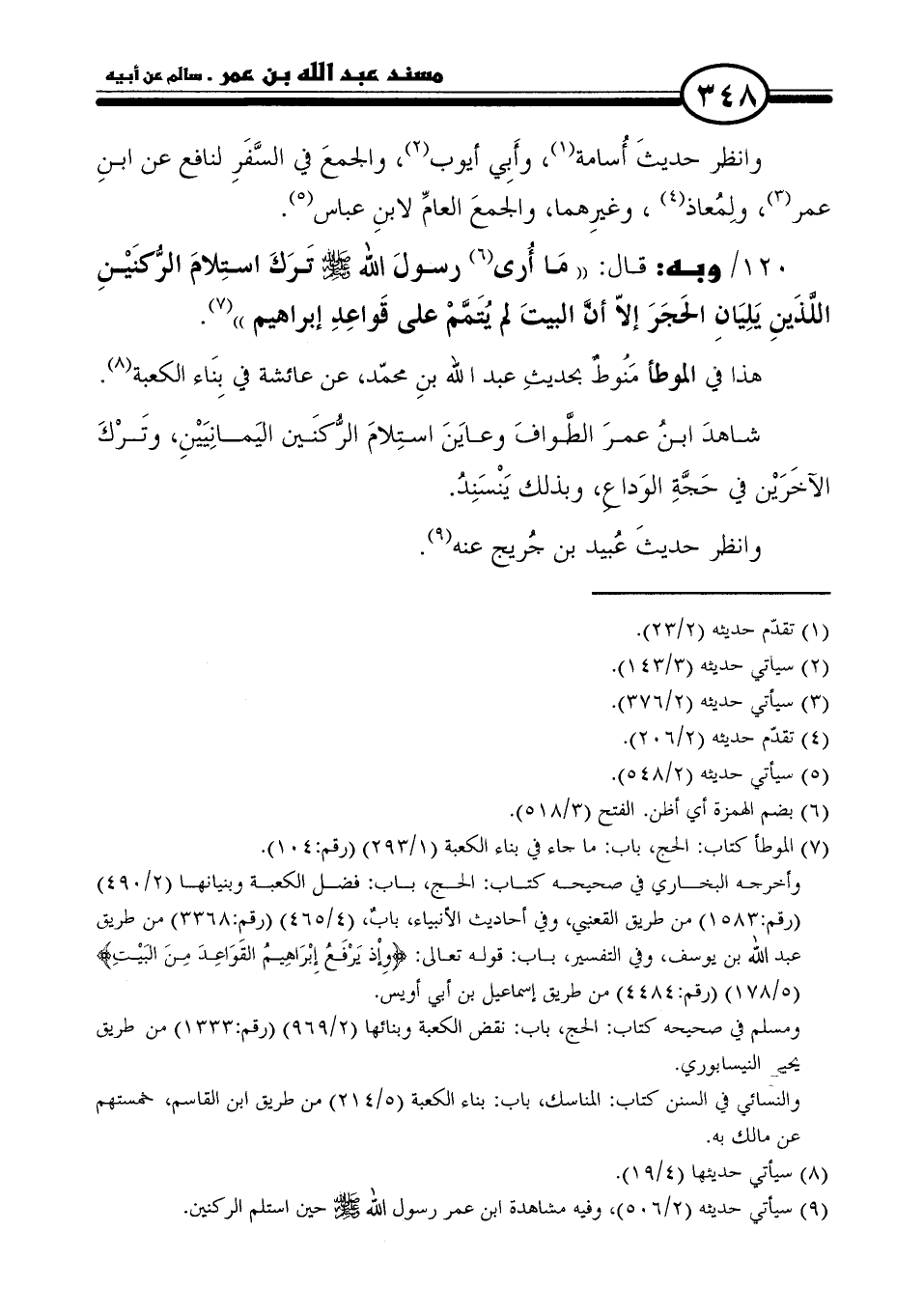 وبه: قال: "مَا أُرى (٦) رسولَ الله - صلى الله عليه وسلم - تَرَكَ استِلامَ الرُّكنَيْنِ اللَّذَينِ يَلِيَانِ الحَجَرَ إلاّ أنَّ البيتَ لم يُتَمَّمْ على قَواعِدِ إبراهيم" (٧).