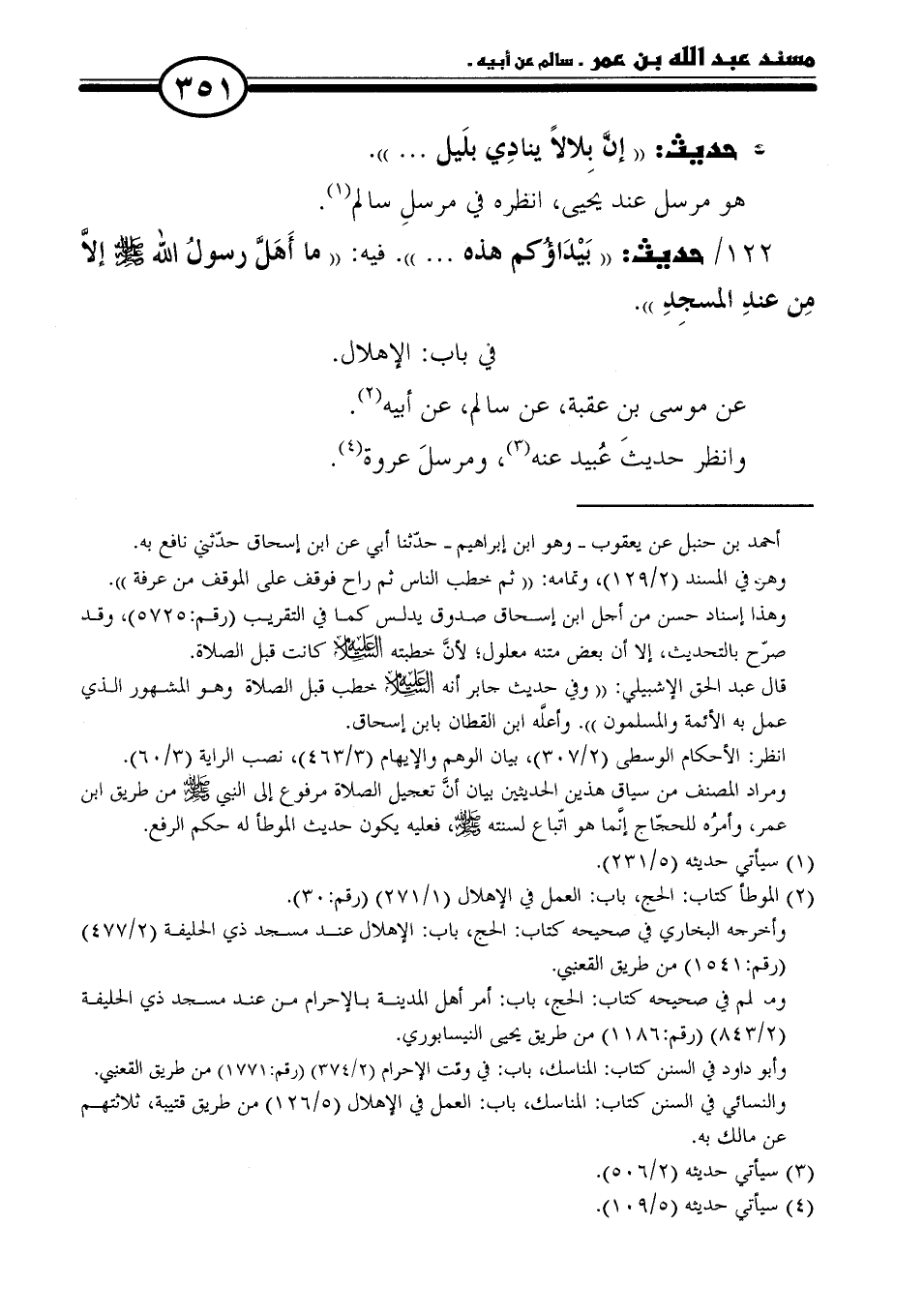 = أحمد بن حنبل عن يعقوب - وهو ابن إبراهيم - حدّثنا أبي عن ابن إسحاق حدّثني نافع به.