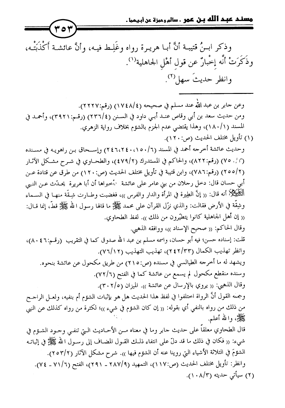 وذكر ابنُ قتيبة أنَّ أبا هريرة رواه وغَلِط فيه، وأنَّ عائشة أَكْذَبَته، وذَكَرَتْ أنَّه إِخبارٌ عن قولِ أهْلِ الجاهلية (١).
