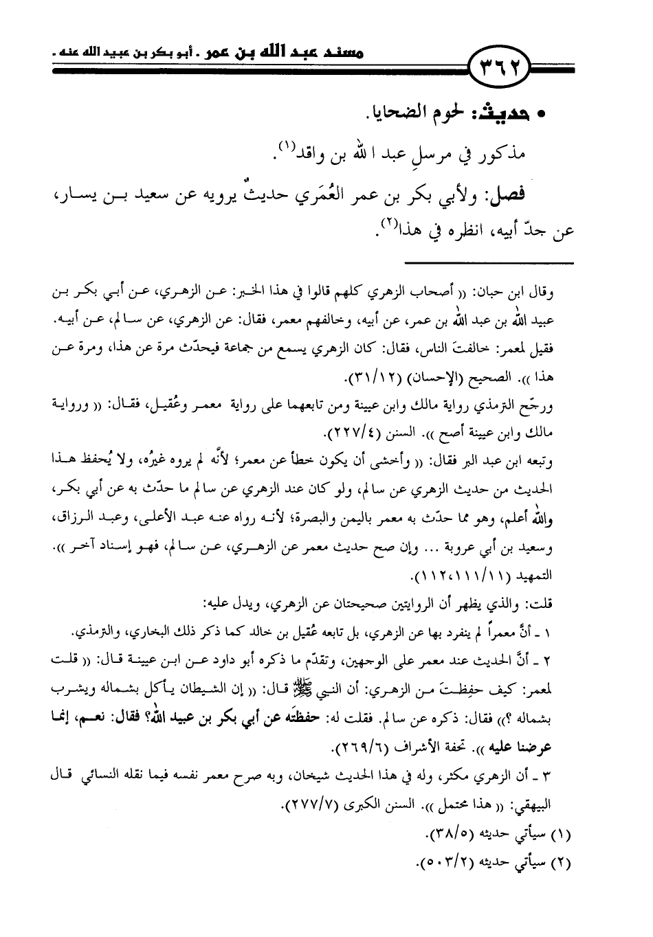= وقال ابن حبان: "أصحاب الزهري كلهم قالوا في هذا الخبر: عن الزهري، عن أبي بكر بن عببد الله بن عبد الله بن عمر، عن أبيه، وخالفهم معمر، فقال: عن الزهري، عن سالم، عن أبيه. فقيل لمعمر: خالفتَ الناس، فقال: كان الزهري يسمع من جماعة فيحدّث مرة عن هذا، ومرة عن هذا". الصحيح (الإحسان) (١٢/ ٣١).