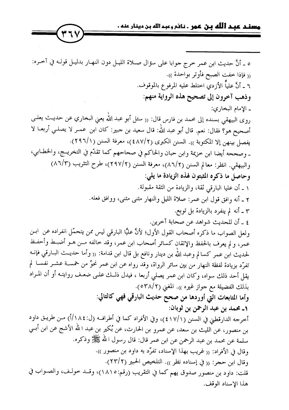 ولعل الصواب ما ذكره أصحاب القول الأول؛ لأنَّ عليَّا البارقي ليس ممن يتحمّل انفراده عن ابن عمر، ولم يعرف بالحفظ والإتقان كسائر أصحاب ابن عمر، وقد خالفه من هو أضبط وأحفظ لحديث ابن عمر كسالم وعبد الله بن دينار ونافع بل قال ابن قدامة: "وأما حديث البارقي فإنه تفرّد بزيادة لفظة النهار من بين سائر الرواة، وقد رواه عن ابن عمر نحوٌ من خمسة عشر نفسا لم يقل أحد ذلك سواه، وكان ابن عمر يصلي أربعا، فيدل ذلك على ضعف روايته أو أن المراد بذلك الفضيلة مع جواز غيره". المغني (٢/ ٥٣٨).