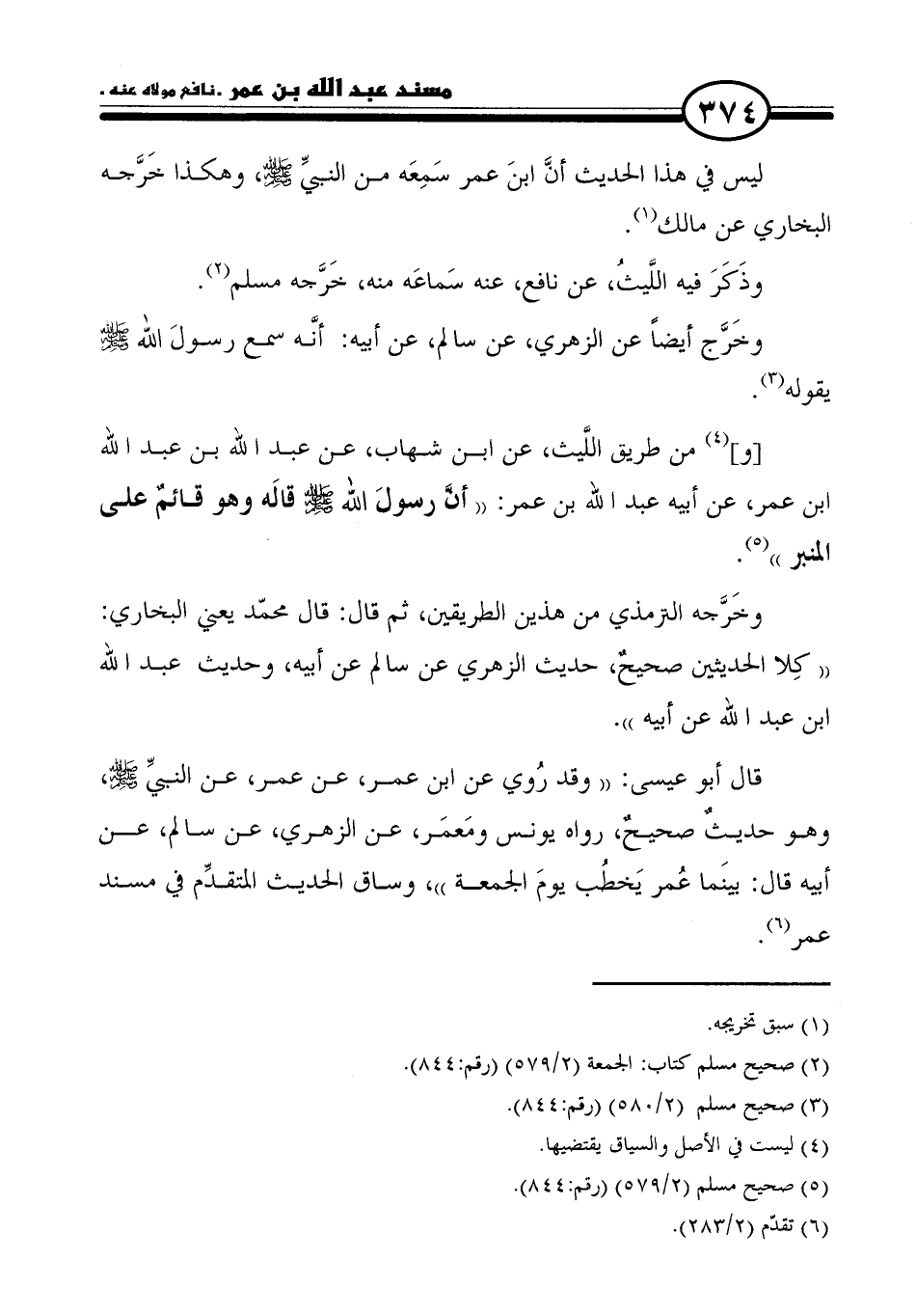 [و] (٤) من طريق اللَّيث، عن ابن شهاب، عن عبد الله بن عبد الله بن عمر، عن أبيه عبد الله بن عمر: "أنَّ رسولَ الله - صلى الله عليه وسلم - قالَه وهو قائمٌ على المنبر" (٥).