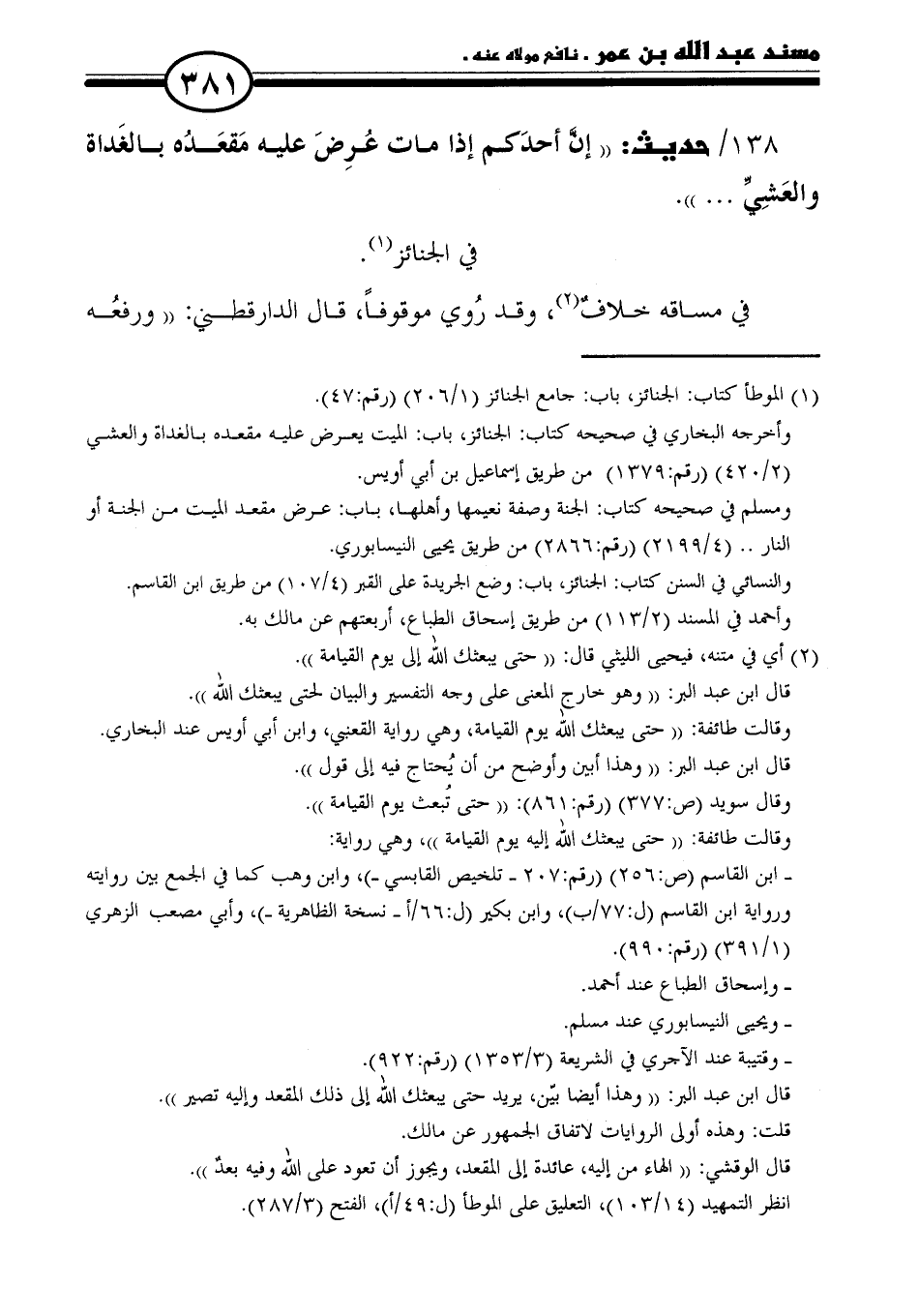 ١٣٨ / حديث: "إنَّ أحدَكم إذا مات عُرِضَ عليه مَقعَدُه بالغَداة والعَشِيِّ ... ".