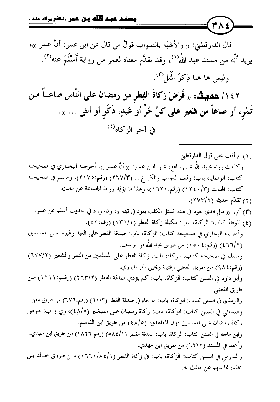 قال الدارقطني: "والأشبَه بالصواب قولُ من قال عن ابن عمر: أنَّ عمر"، يريد أنَّه من مسند عبد الله (١)، وقد تقدَّم معناه لعمر من رواية أَسْلَمَ عنه (٢).