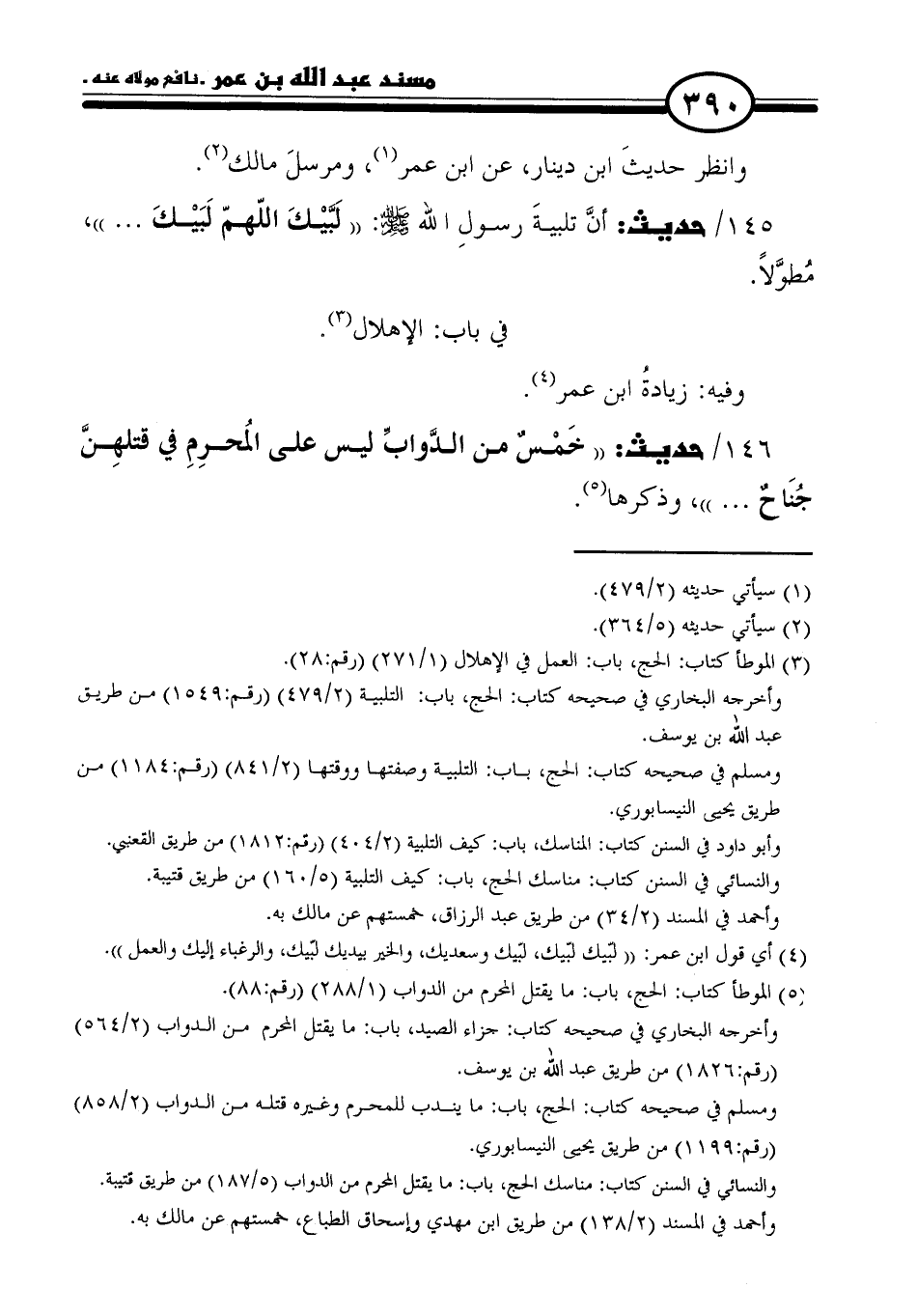 ١٤٦/ حديث: "خَمْسٌ من الدَّوابِّ ليس على المُحرِمِ في قتلهِنَّ جُنَاحٌ ... "، وذكرها (٥).
