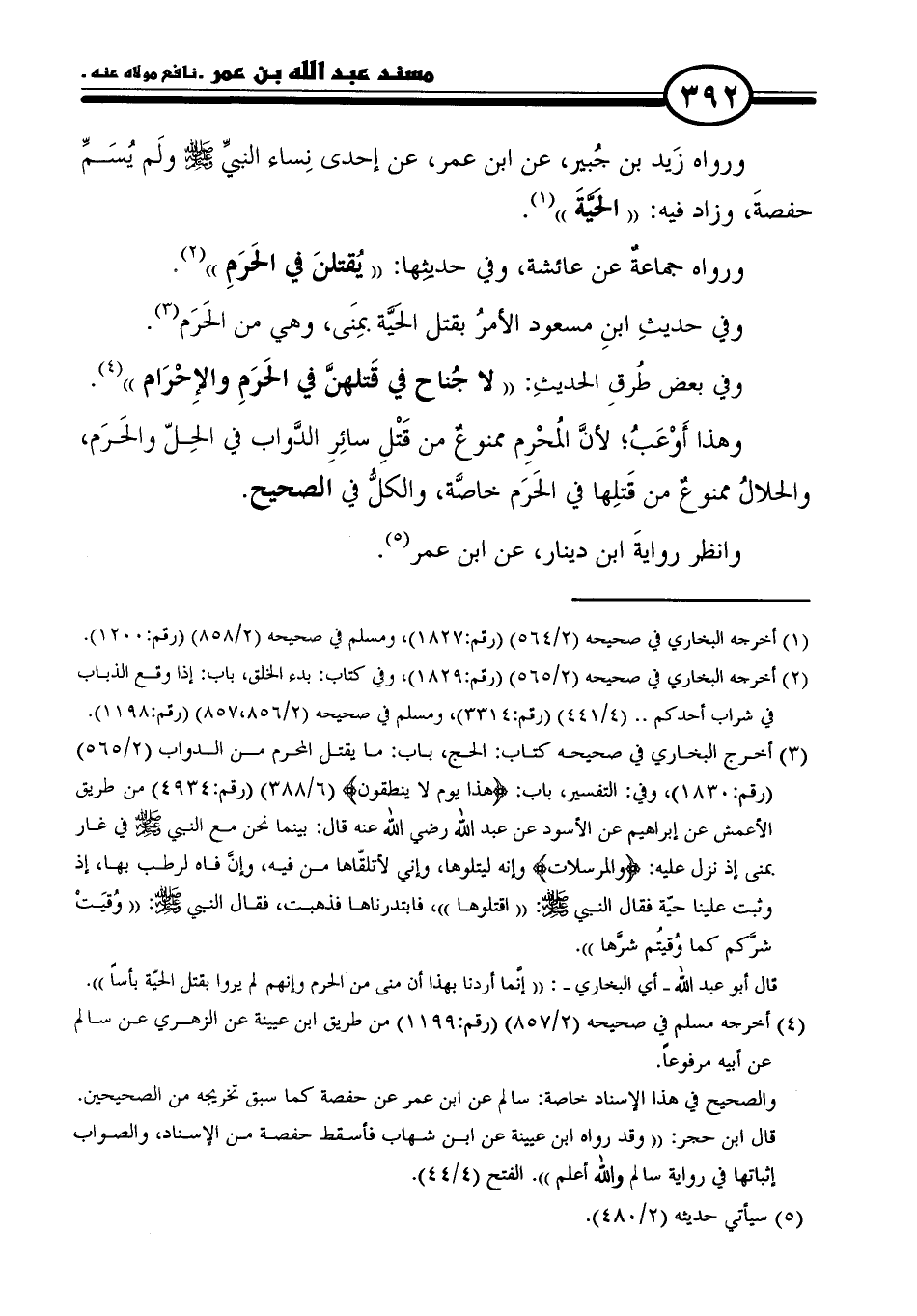 ورواه زَيد بن جُبير، عن ابن عمر، عن إحدى نِساء النبيِّ - صلى الله عليه وسلم - ولَم يُسَمِّ حفصةَ، وزاد فيه: "الحَيَّةَ" (١).