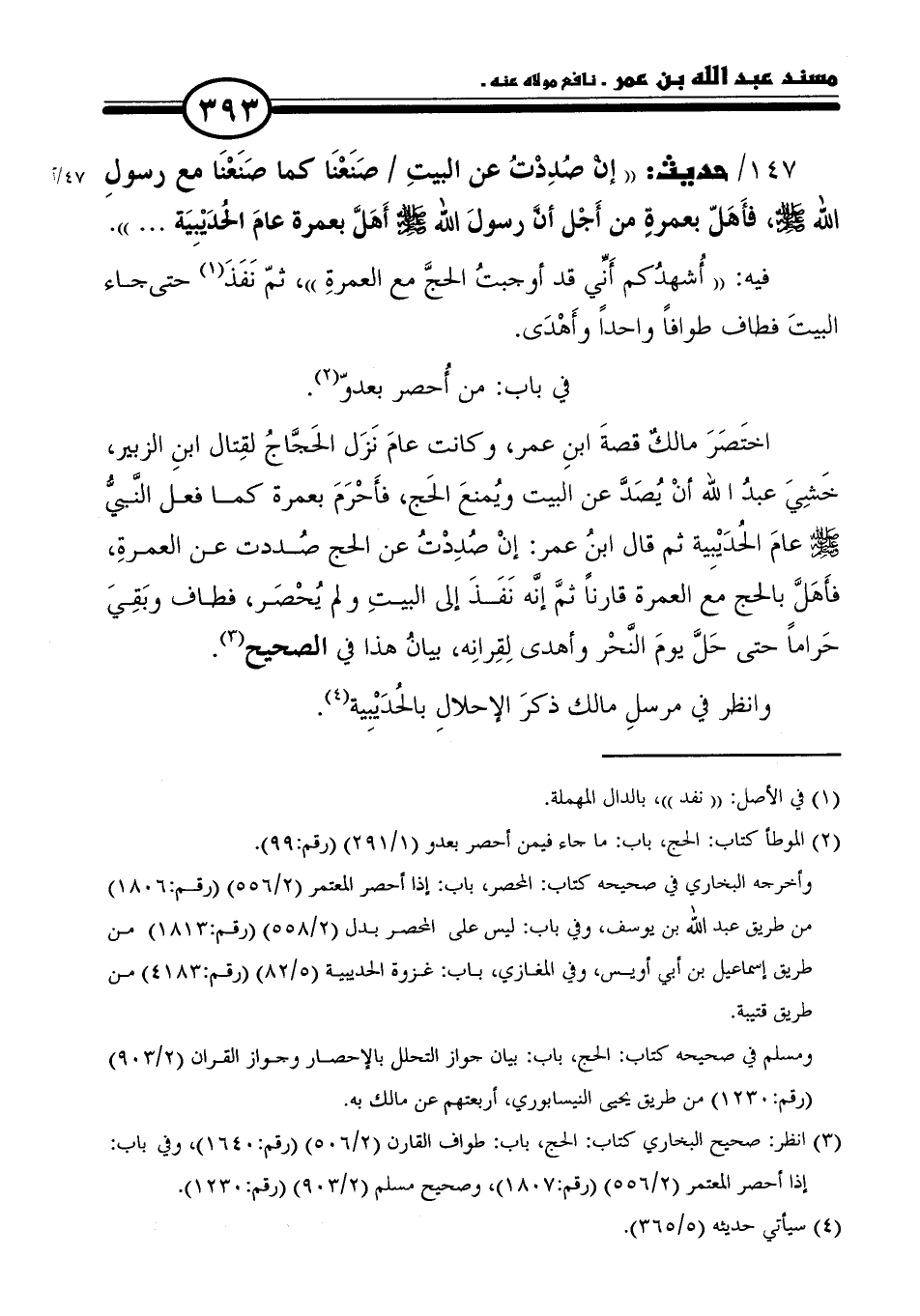 ١٤٧ / حديث: "إنْ صُدِدْتُ عن البيتِ صَنَعْنَا كما صَنَعْنَا مع رسولِ الله - صلى الله عليه وسلم -، فأَهَلّ بعمرةٍ من أَجْل أنَّ رسولَ االله - صلى الله عليه وسلم - أَهَلَّ بعمرة عامَ الحُدَيْبِيَة ... ".