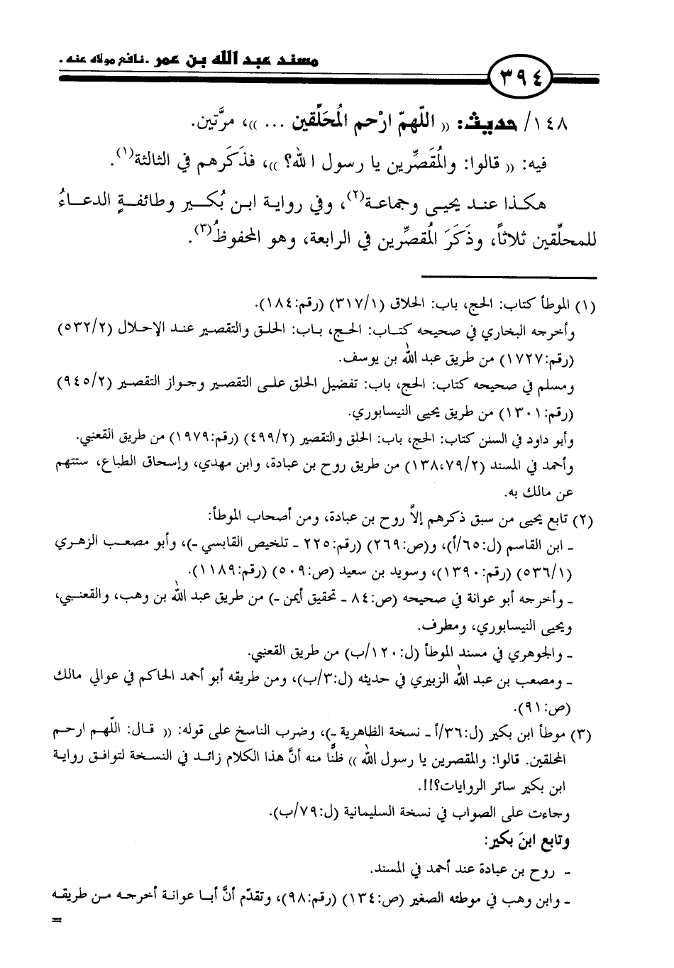 (٣) موطأ ابن بكير (ل: ٣٦/أ - نسخة الظاهرية -)، وضرب الناسخ على قوله: "قال: اللهم ارحم المحلقين. قالوا: والمقصرين يا رسول الله" ظنًّا منه أنَّ هذا الكلام زائد في النسخة لتوافق رواية ابن بكير سائر الروايات؟ ! ! .