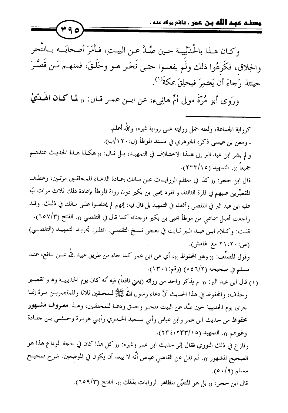 (١) قال ابن عبد البر: "لم يذكر واحد من رواته (يعني نافعًا) فيه أنه كان يوم الحديبية وهو تقصير وحذف، والمحفوظ في هذا الحديث أنَّ دعاء رسول الله - صلى الله عليه وسلم - للمحلقين ثلاثا وللمقصرين مرة إنما جرى يوم الحديبية حين صُد عن البيت فنحر وحلق ودعا للمحلقين، وهذا معروف مشهور محفوظ من حديث ابن عمر وابن عباس وأبي سعيد الخدري وأبي هريرة وحبشي بن جنادة وغيرهم". التمهيد (١٥/ ٢٣٤، ٢٣٥).